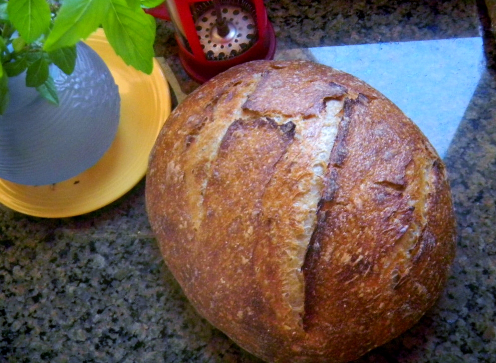 Still we slashed it slashed it 3 times since it was now so spread out after and slid onto the bottom of the combo cooker covered for steam.  Once the lid came off, the bread was baked another 15 minutes at 425 F until it was deemed done with a bottom thump or two.