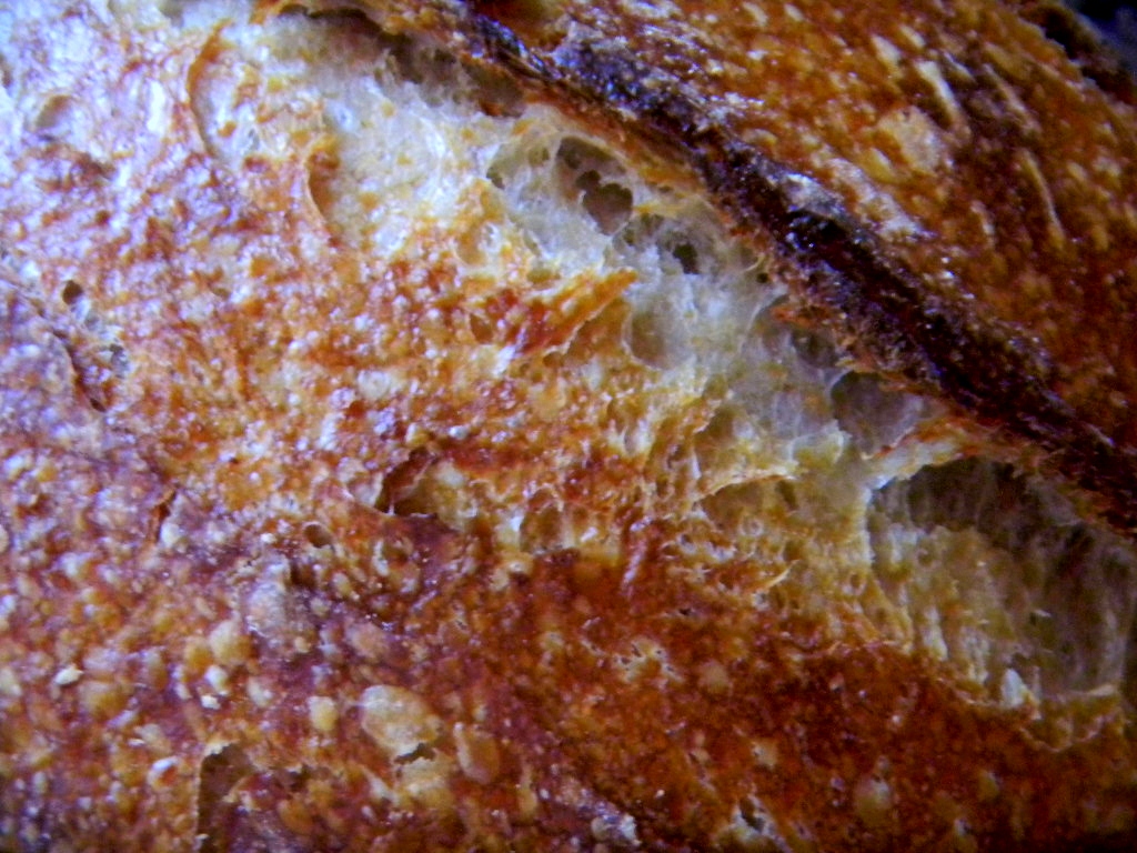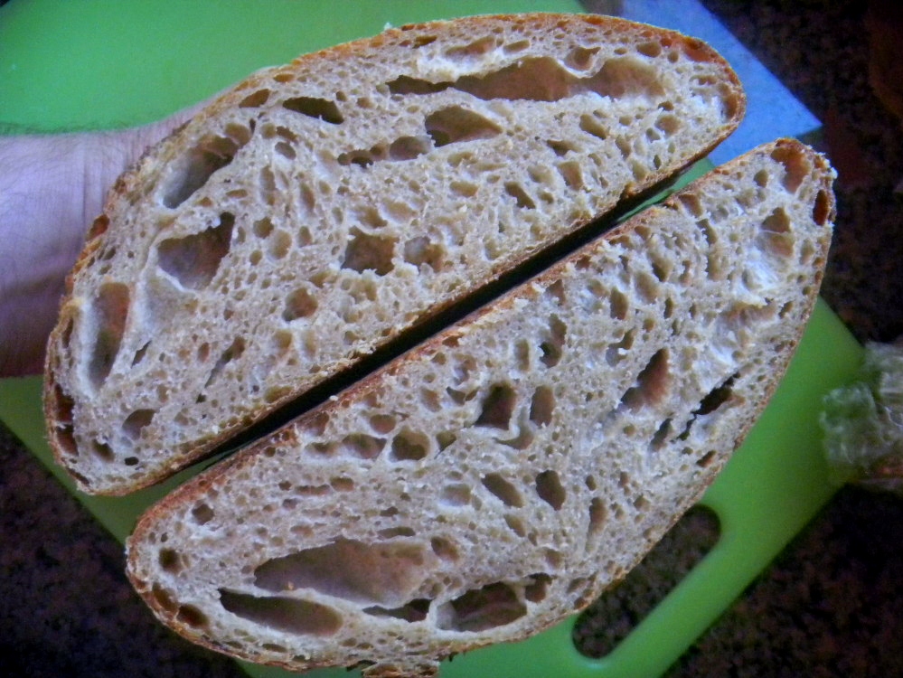 The bread bloomed and sprang well under steam and browned well under the dry heat.  We will have to see how the crust turns out after it cools.  The irregular open crumb that YW brings to bread is unmatched - as is the moistness and sweetness of the crumb. For being manhandled this bread still cam through.  It doesn't taste like a SD sprouted grain bread -) it tastes like a SD YW bread instead - fine and dandy with me.  This will make a fine sandwich and dipping bread.