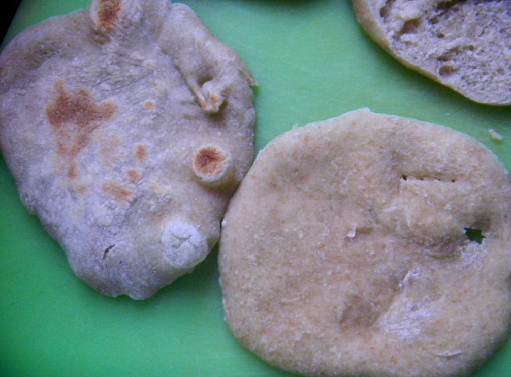 We then placed them on parchment, in a plastic bag to final proof. We decided to bake half on a stone at 425 F with steam and to dry fry half in a Teflon coated, electric skillet at 350 F like we do English muffins so that we could compare them and see which way we liked best.