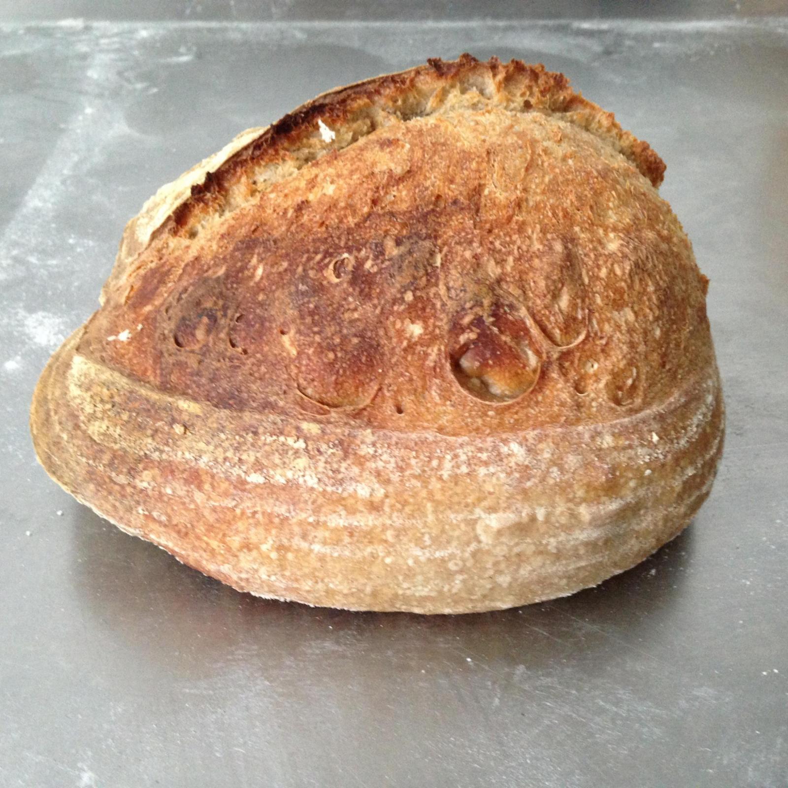 end you're showing us. See how the middle looks like it's traveling right into our faces? Bubbles in the middle taper away to points. That mass of bubbles was kept from expanding, found a weak spot at the end (where we are) broke through and gave birth. The oven temp looks right on target.
