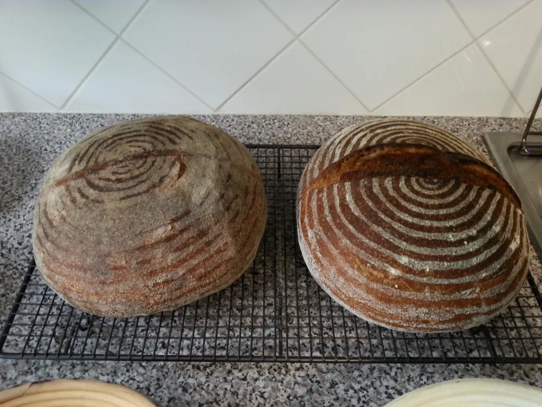 The above are a couple of boules I made yesterday; same dough, split after kneading. Both were taken out of the fridge about 2 hours before baking, with the right- hand loaf being baked second (small oven).