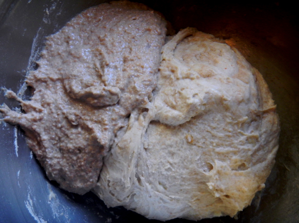 The whole grains make up 50% of the flour in this mix, they were all sprouted and consisted of einkorn, emmer and spelt.   Boiled potato wasn’t enough so Lucy added potato flakes and used the water to boil the potatoes as the dough liquid.  In keeping with her penchant to put rye flour in every bread, she snuck some whole rye into the first of 3 levain builds.