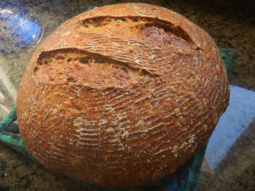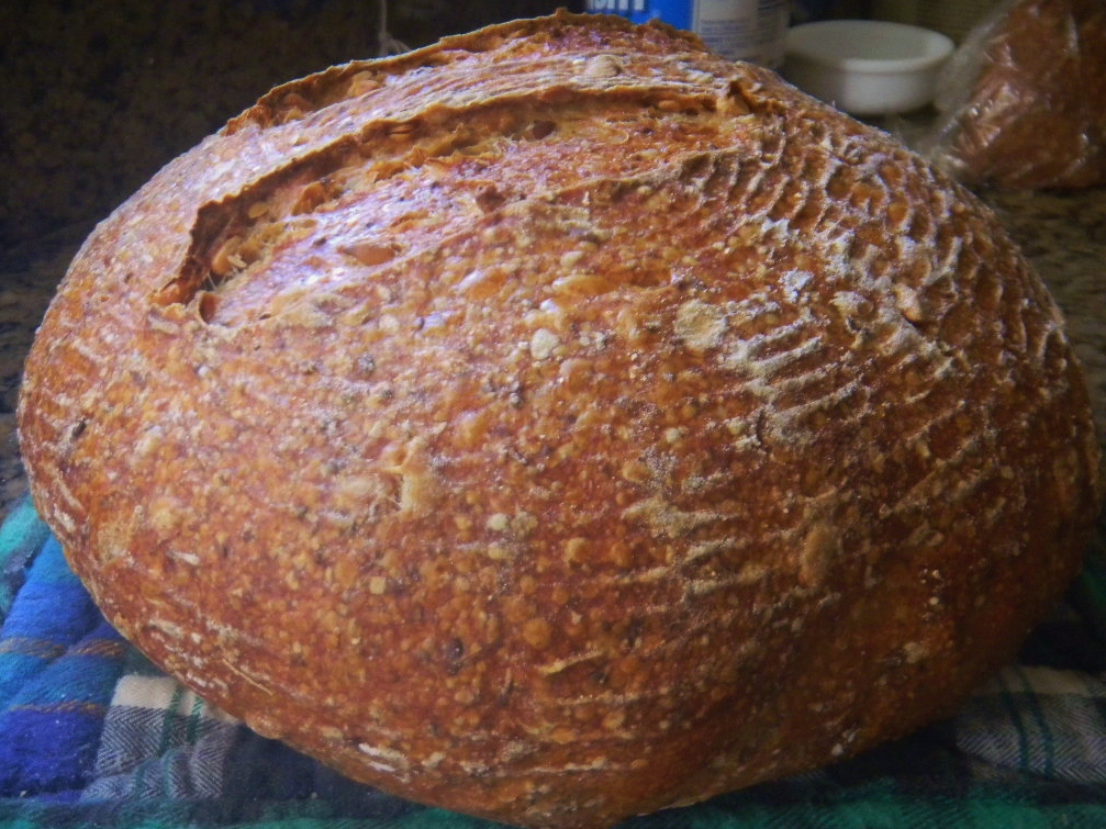 We will have to wait and see exactly what happened when we slice the bread for lunch in a few hours.  The crumb came out very soft moist and open for a bread of this type.  Most of all it is delicious.  The sprouted grains and seeds really came through and it made a fine summer sausage sandwich for lunch with the usual fixings.  We like this bread a lot,.