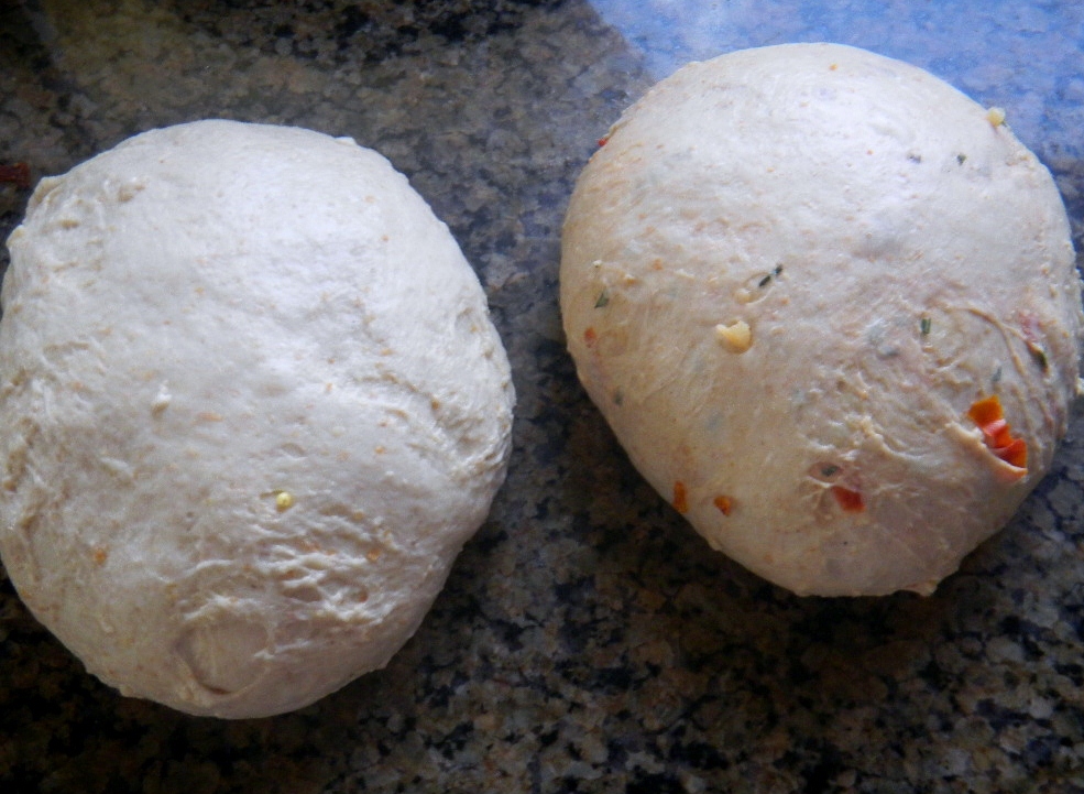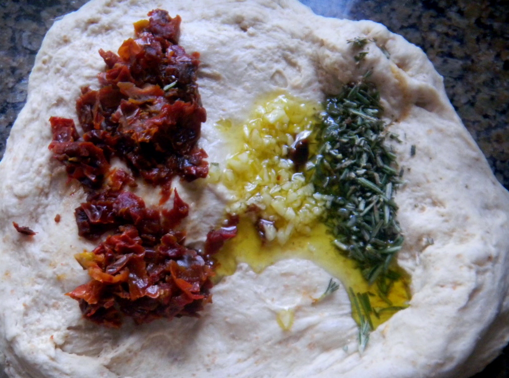Re-hydrated sun dried tomatoes, garlic infused olive oil and fresh rosemary added to  half the dough.