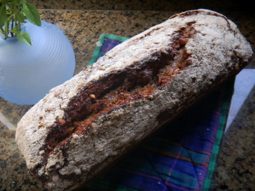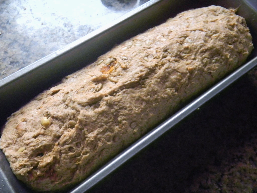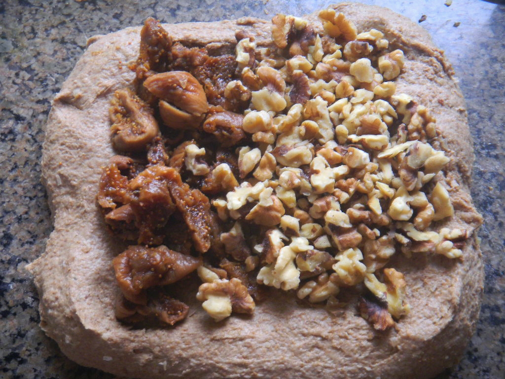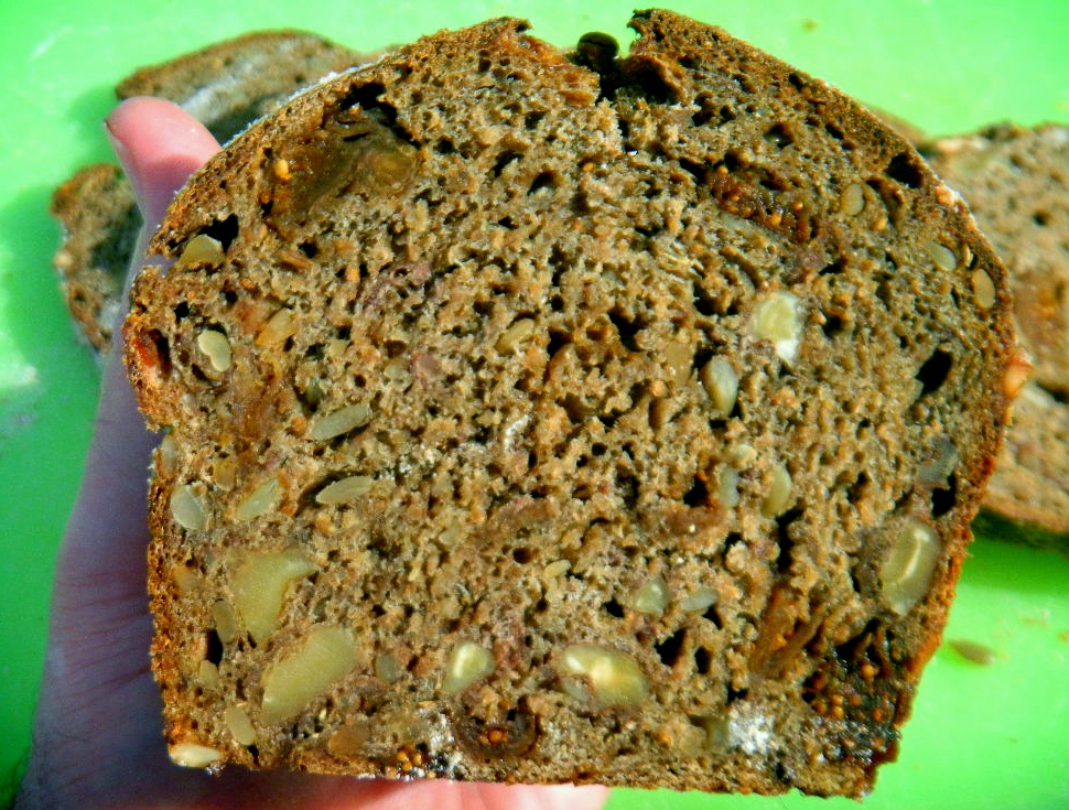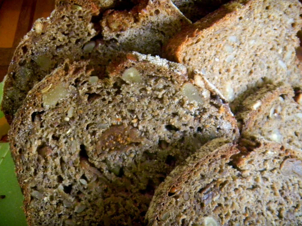 this would be a simple if 'full of it' bread, Normally I would use prunes instead of Turkish figs. They taste nearly as good but lack the black color so net time we will use black figs. We like this one a lot. Hearty, healthy, earthy with a bit of sweetness. I've just been eating it plain but can't wait to have it as toast with butter this morning,
