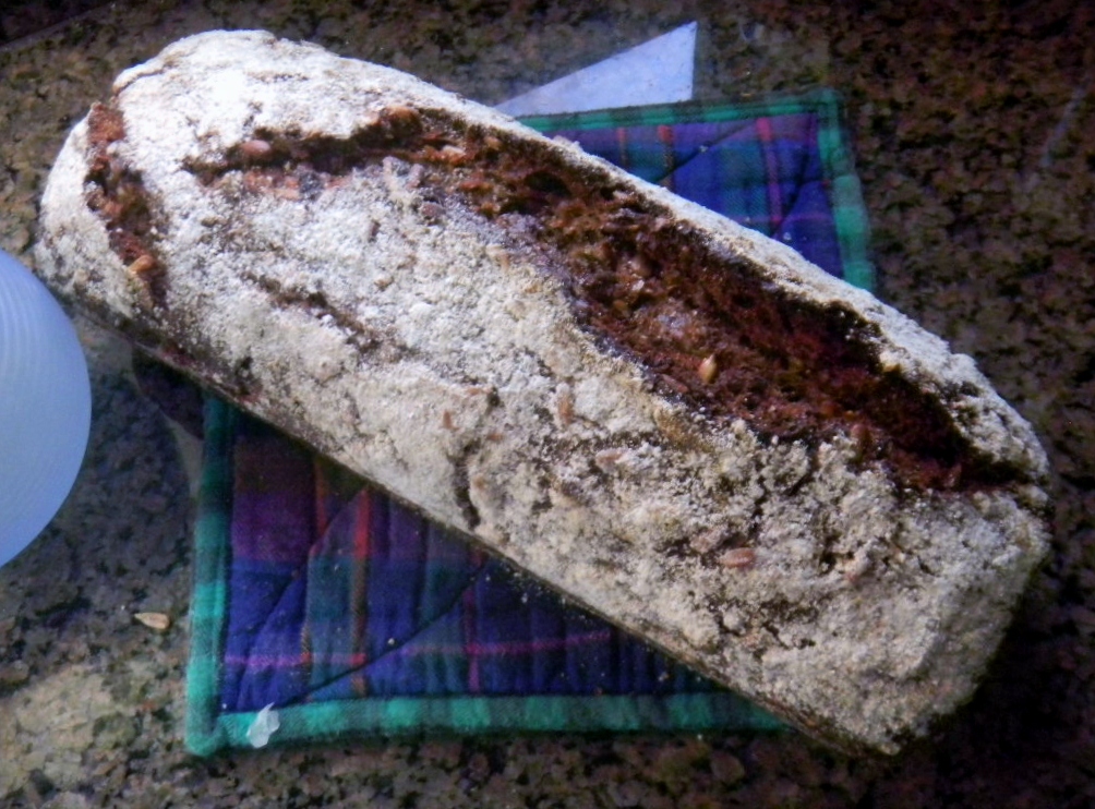 The dough was proofed in a plastic trash bag until it rose, cracked well on top and looked ready for the oven. We baked it with Mega steam at 425 F for 30 minutes and then removed the steam and baked it for another 30 minutes at 400 F. It bloomed and cracked all the way down the middle and the crumb was fairly open for a bread with this much stuff in it. It tastes terrific and my new favorite bread to make as a very last one as well as one to savor and enjoy on World Bread Day 2015.