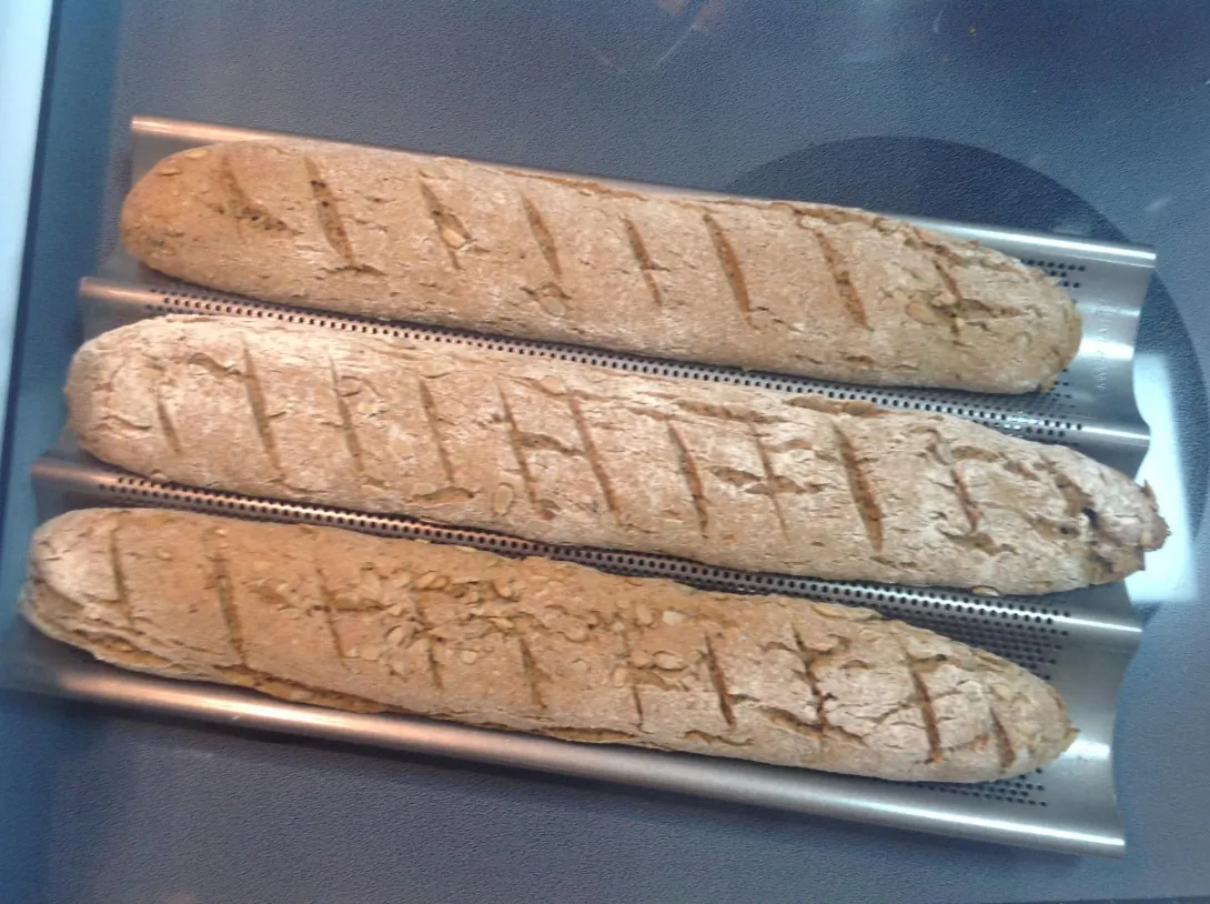 Just joined, second post after Intro post, yesterday's bread making, Chapati Flour, Zaatar Herb, roasted sunflower seeds, first time using new baguette tray, as you can see I have a long journey ahead, need to read Lessons on front of website. Texture is slightly crumbly.