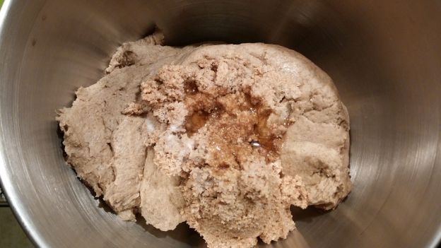 3) Combined flour and starter from the fridge, and about 15 grams of maple syrup. Total hydration was about 75% at this point.