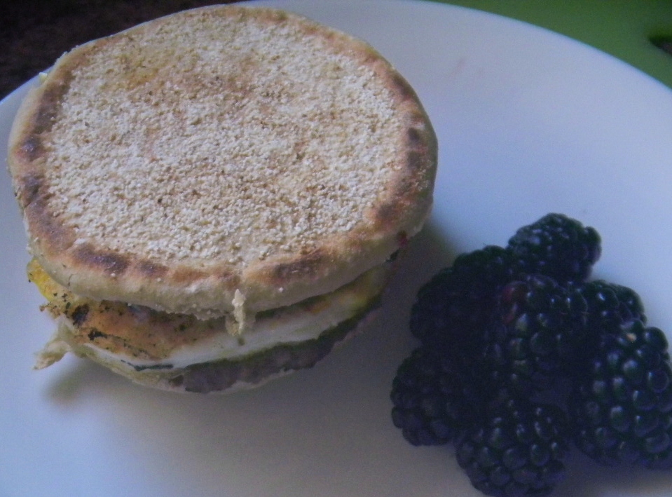 Sourdough English Muffin, Swiss Cheese, Egg and Sausage Sandwich.