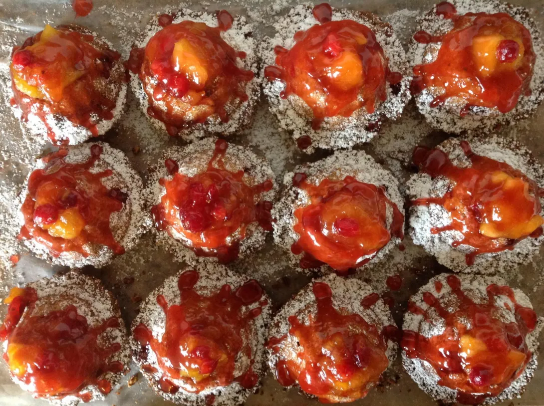 I bake mostly by feel but the basics of my personalized recipe (just for the muffins, not the filling) is as folows: 1 stick (4oz) unsalted butter1-2 tablespoons salted butter, to grease pan1 cup or less sugar (white or brown)1 egg, large as possible, separated 3/4 cup whole wheat pastry flour1/1/4 cup unbleached white flourscant teaspoon iodized salt1/2 teaspoon baking soda1/2 teaspoon baking powder 1/8 teaspoon cream of tartar 4-6 oz fruit juice concentrate/grated apples, or other fruit such as sour cherries (chopped), diced peaches/pears, mashed banana, etc. confectioner's sugar for dusting Options:handful chopped walnuts (or any other soft nut)handful raisins or any other dried fruit, such as dates or even crystalized gingerhandful semi-sweet mini chocolate chips 6 oz whole cranberries (half package)brown sugar, nutmeg and cinnamon, maybe some allspice, ginger or cloves too sweetened shredded coconutbrown sugar, nutmeg and cinnamon to glue on:chopped pecans or sliced almonds Reserve a couple ounces of the two mixed flours to sprinkle on the greased pans. Combine softened butter with sugar, egg yolk and stir/whisk/beat until well blended. Mix together first five dry ingredients and blend into the above (with pastry dough blender or comparable food processing aid) to achieve a uniform crumb (resembles a fine meal). Mix in the walnuts and any of the optional dry ingredients, then stir in enough of the fruit juice concentrate/prepared fruit until you have a semi soft dough spouting visible bubbles. Whisk egg white with cream of tartar and fold into the dough, to end up with a slightly stiff batter. Fill each muffin cavity about 3/4 full, just topping the center prong. (You can whack the pan down on your counter a few times to level the surfaces and adjust fills accordingly.) While preheating oven at 350º, even out muffin tops by pressing in coconut, or generously sprinkle with spiced brown sugar and then gently press in the chopped or sliced nuts. Okay, the oven should be at temperature by now! Bake for 17-20 minutes, until tops are firm and a bit crackled. Cool on rack 15 minutes, then invert onto waxed paper and fill with glazed fruit. Fruit Filling: Well I don't have a standard recipe for this at all, here's where I cook entirely on the fly, by taste and texture. You'll want to create about a pint of your own fruit preserves, just runny enough to trickle down the sides of the volcanoes (if so desired; I don't always bother about that) and fill the muffins with it hot off the stove. Just as an example, I brewed up this week's concoction from a few golden delicious apples (they don't brown, and hold their shape through cooking) peeled, cored, cubed and dredged in sugar. Simmered in wide pan while grating the rind of a few tangerines, half of which was reserved for the muffin batter. Dumped the allotted zest into the apples along with all the juice I managed to squeeze out of the denuded tangerines, then stirring occasionally reduced the whole mixture to a sauce while prepping the muffins. Deciding at the last minute I also wanted cranberries in the topping to complement without muddying its bright orange color, separately whipped up some cranberry sauce — substituting mango passionfruit juice for the water ordinarily called for, because you can never have too much flavor, right? Unfortunately, even as the cranberries started to burst the mixture had not begun to thicken, so I removed from heat and fished them out with a slotted spoon, gently swirling into the apple tangerine compote. This I used to fill the muffins once they were out of the pan and dusted with the confectioner's sugar. Left with a saucepan of sweetened mango passion cranberry juice, returning to medium heat I vigorously whisked into that a little blend of equal parts table sugar and potato starch (because it comes out smooth and clear, unlike corn) until just beginning to gel. Threw in a capful almond extract and a quarter stick of butter to give the bright red sauce the consistency of melted candle wax, which set as I dribbled it all over the volcanoes. Happy Thanksgiving!I will have to look into getting one of those pans, but reserve trying for a special occasion like celebrating that it's Tuesday.