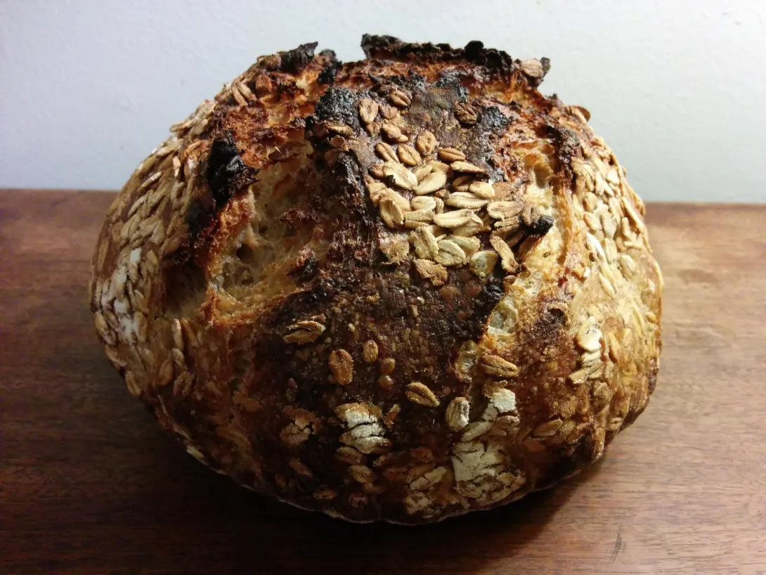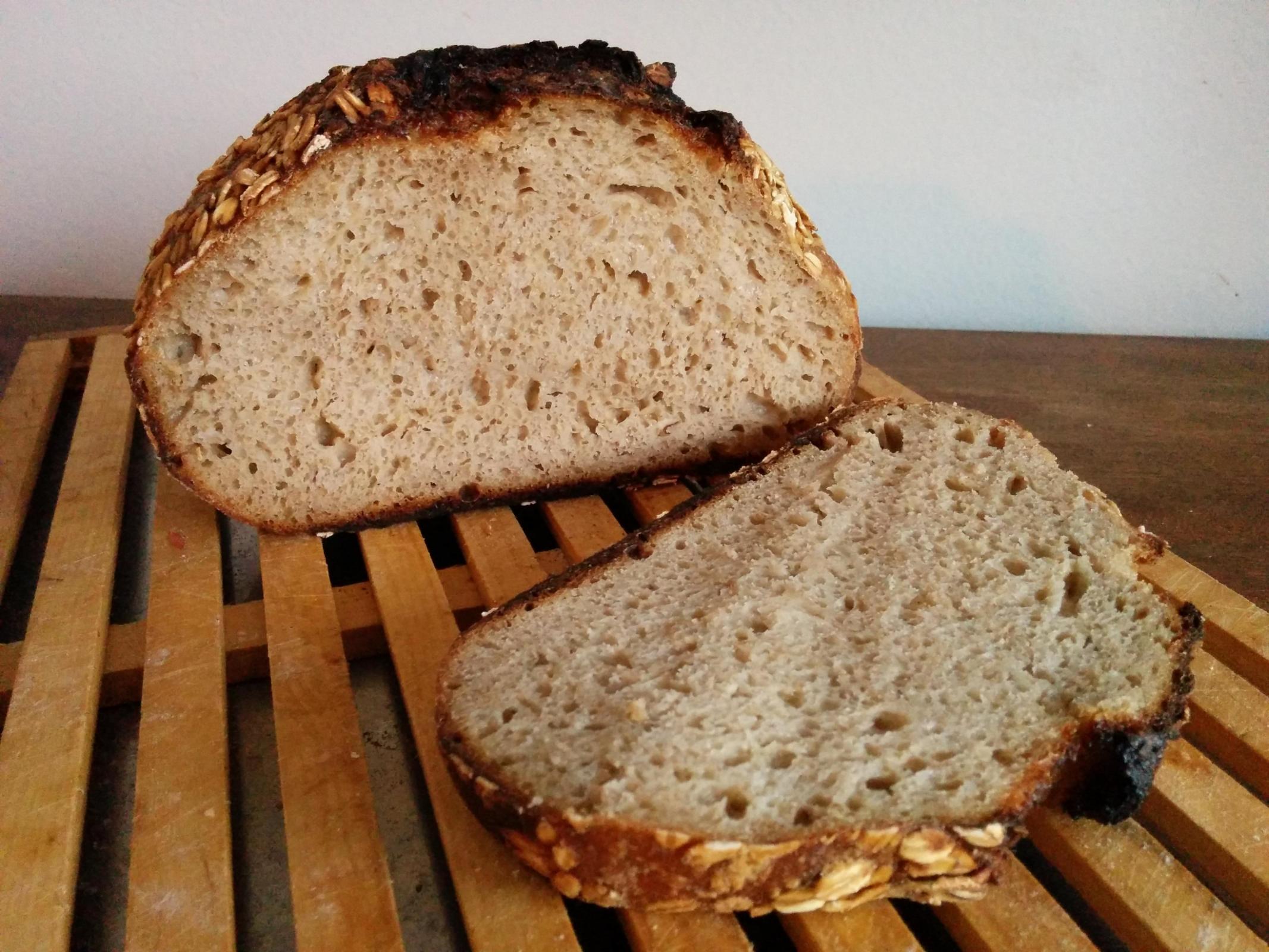 I'm posting pictures of my latest bake (I call it Sparky 7, after my starter) because, well, I think it turned out really well and I couldn't have done it without your help. It's an oat porridge loaf from Tartine 3. I pretty much followed the recipe as written in the book, although I suspect my porridge had significantly less oats and more water than intended due to a porridge scorching incident. As mentioned by others on the site, the 1:2 oat:water ratio suggested in the book seems unrealistic given how absorbent oats are, but I'll have to try it again to make sure. Even so, it's a great recipe: five days after baking, the loaf still didn't seem stale, and the oat flavour was lovely.