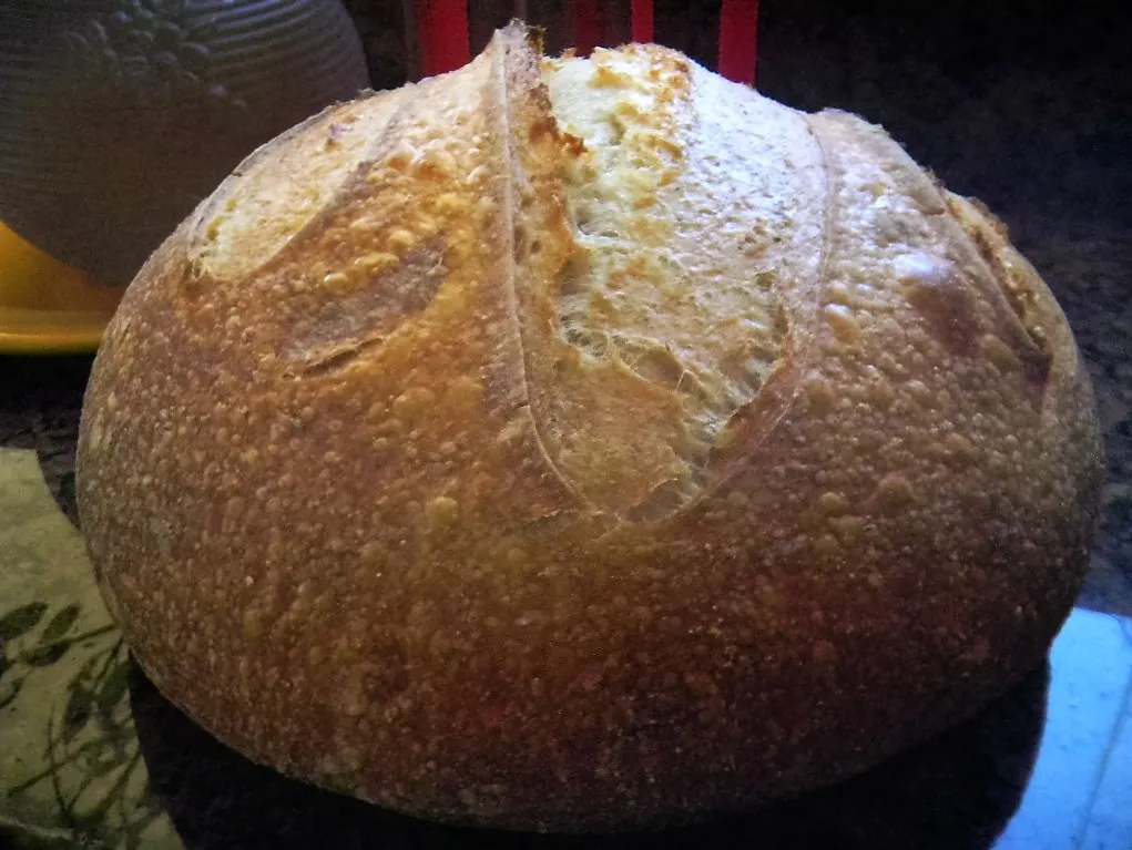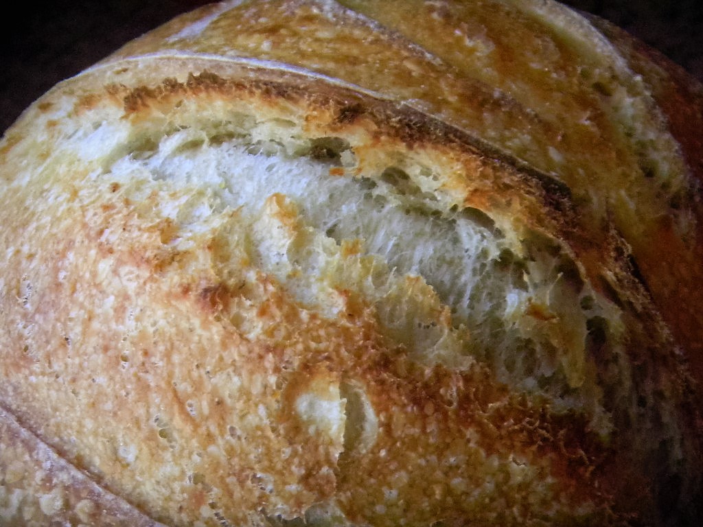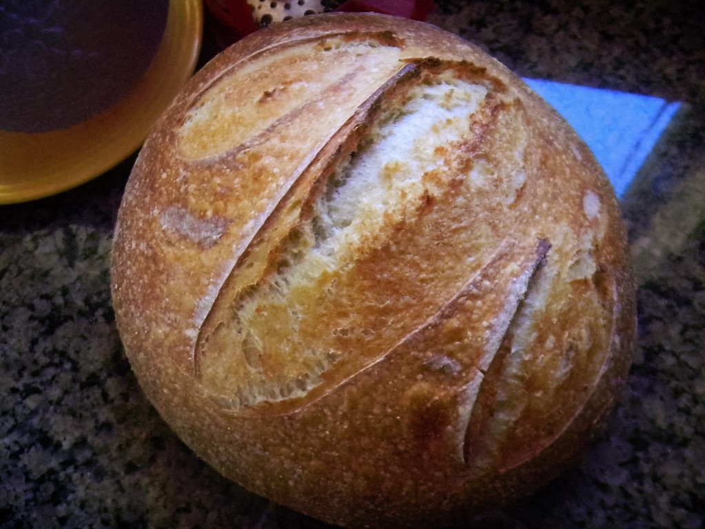 Once the steaming was done, we continued to bake at 425 F, convection this time, for another 15 minutes until the bread thumped done. It bloomed, blistered and sprang well enough under cover and browned up nicely with the dry heat. We will have to wait to see how the crumb came out when we slice it for dinner.
