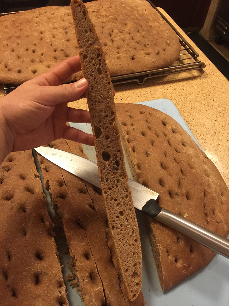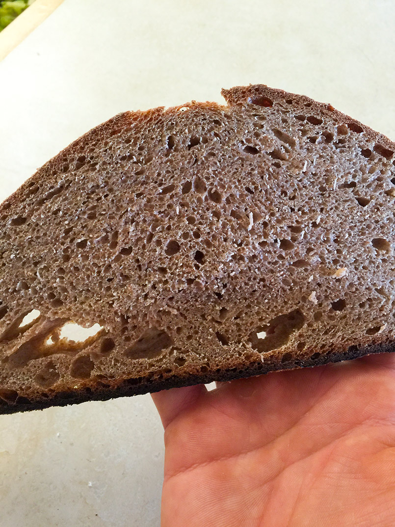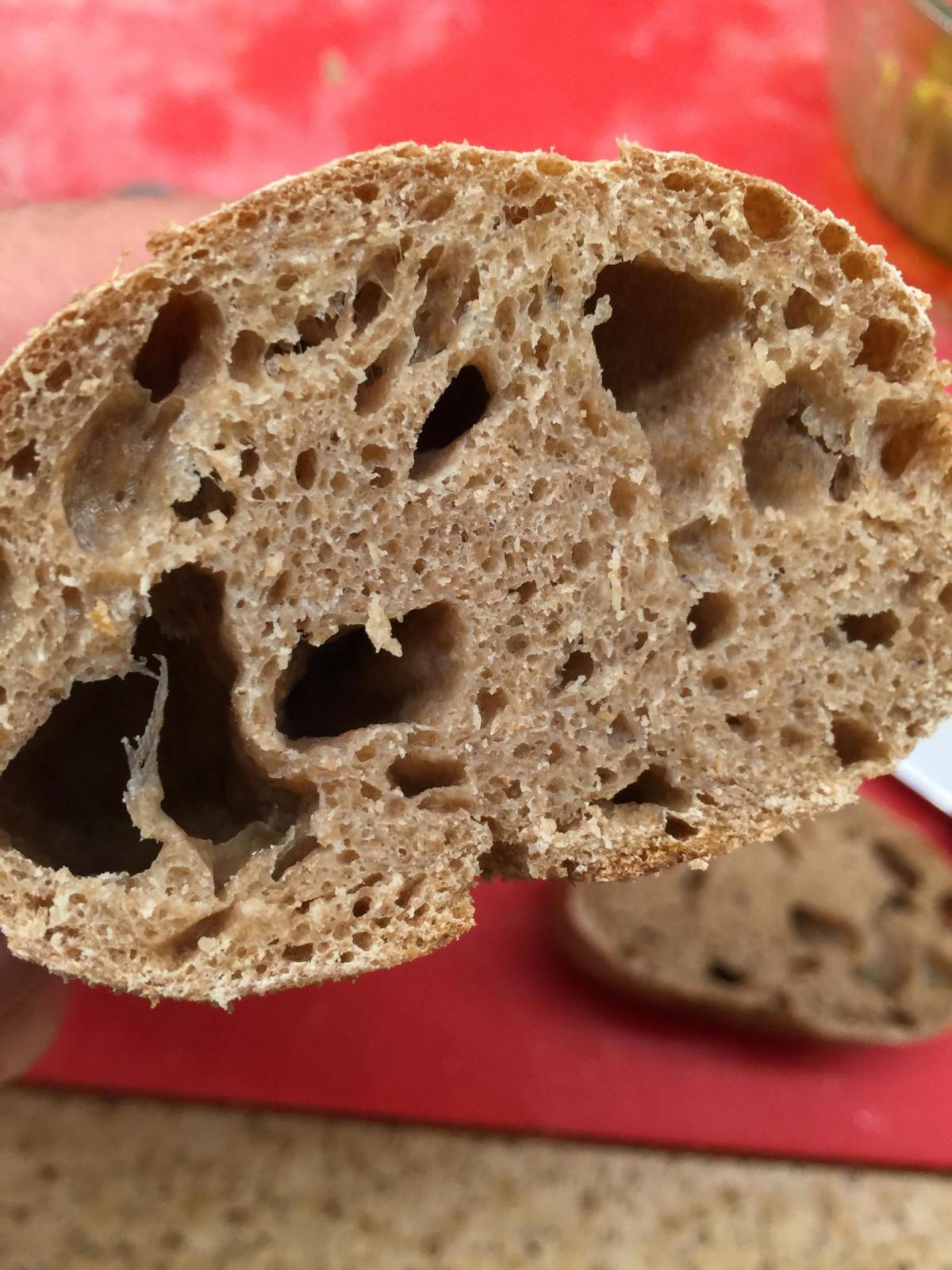 This time, I got about the same oven spring, but the crumb was a little nicer. Smallish hole size, but a bit irregular and the bread seemed to have a lighter overall texture. Both this loaf and the two before were 100% WW at 70.5% hydration according to PR recipe.