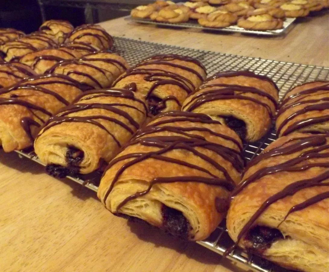 I roll it out about 7mm or so and cut 9 x 14cm, pipe very stiff ganache (if its too soft itll all melt out) put candied pecans with it and fold like traditional pain au chocolate - with the 2 fillings twice. I bake @ 210C for about 17 - 18mins with steam, vented @ 10mins.
