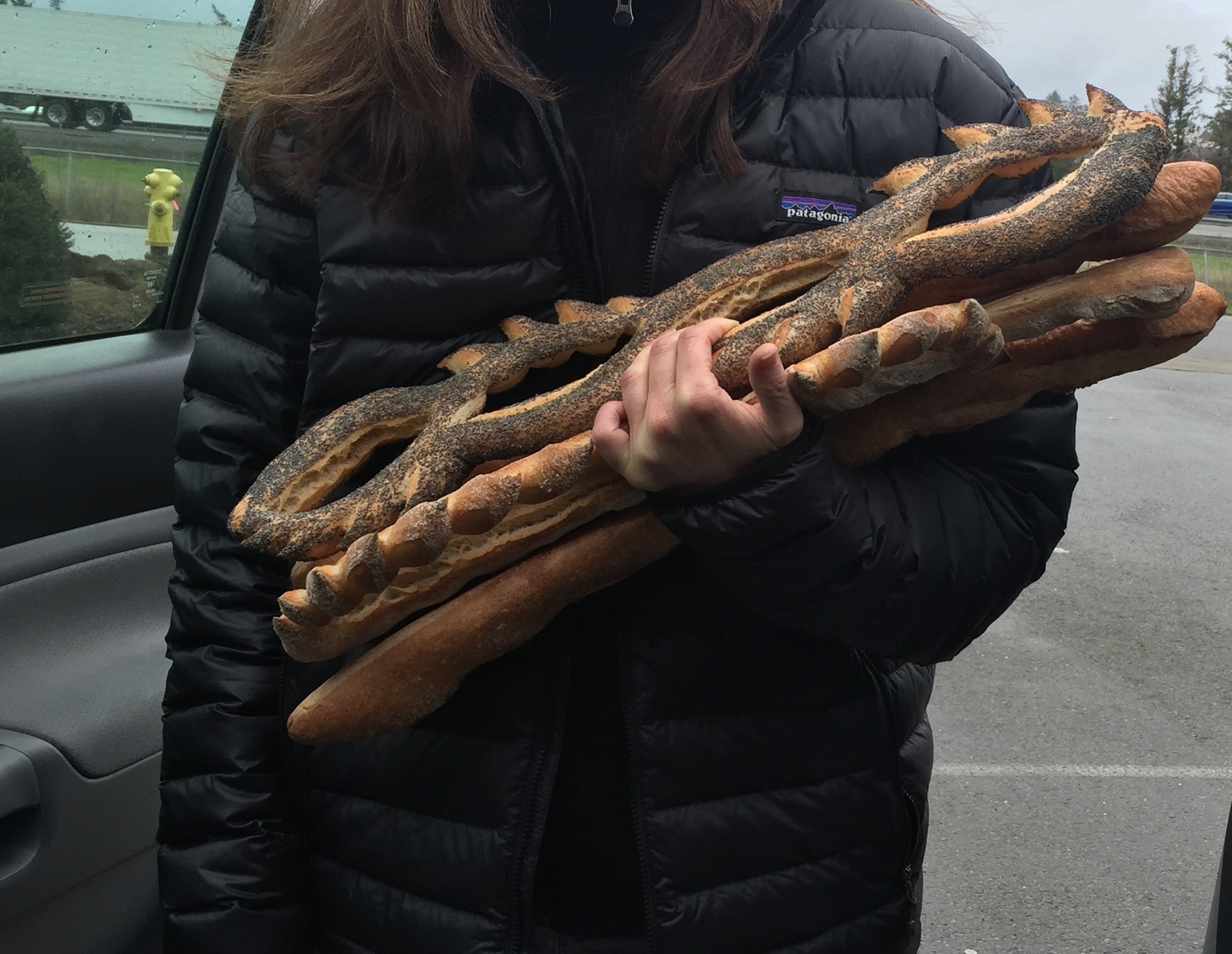 Nicky Giusto is a competitive baker who is getting ready to compete for Team USA in the Coupe de Monde Boulangerie competition. Nicky wasn't there (he is in training with Team USA, they meet all over the country to train) but he had done a test bake the day before with lots of baguettes, epis, and other pretty decorative loaves. The breads were day-old and Lon offered for us to take what we wanted. The two baguettes we grabbed were phenomenal. I have never had baguettes that had such a creamy, translucent, custardy and open crumb. Even the two day-old baguettes sitting in my warm truck were like a sweet, wheaty, toasty perfume that filled the air after only a couple of minutes. I wish I took a photo of the crumb.