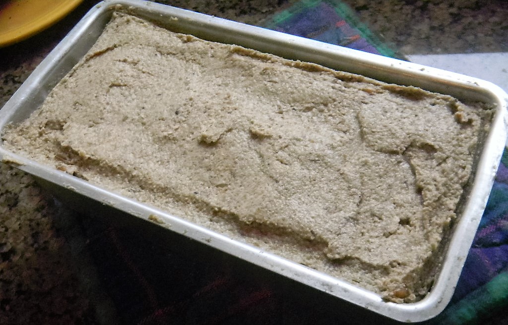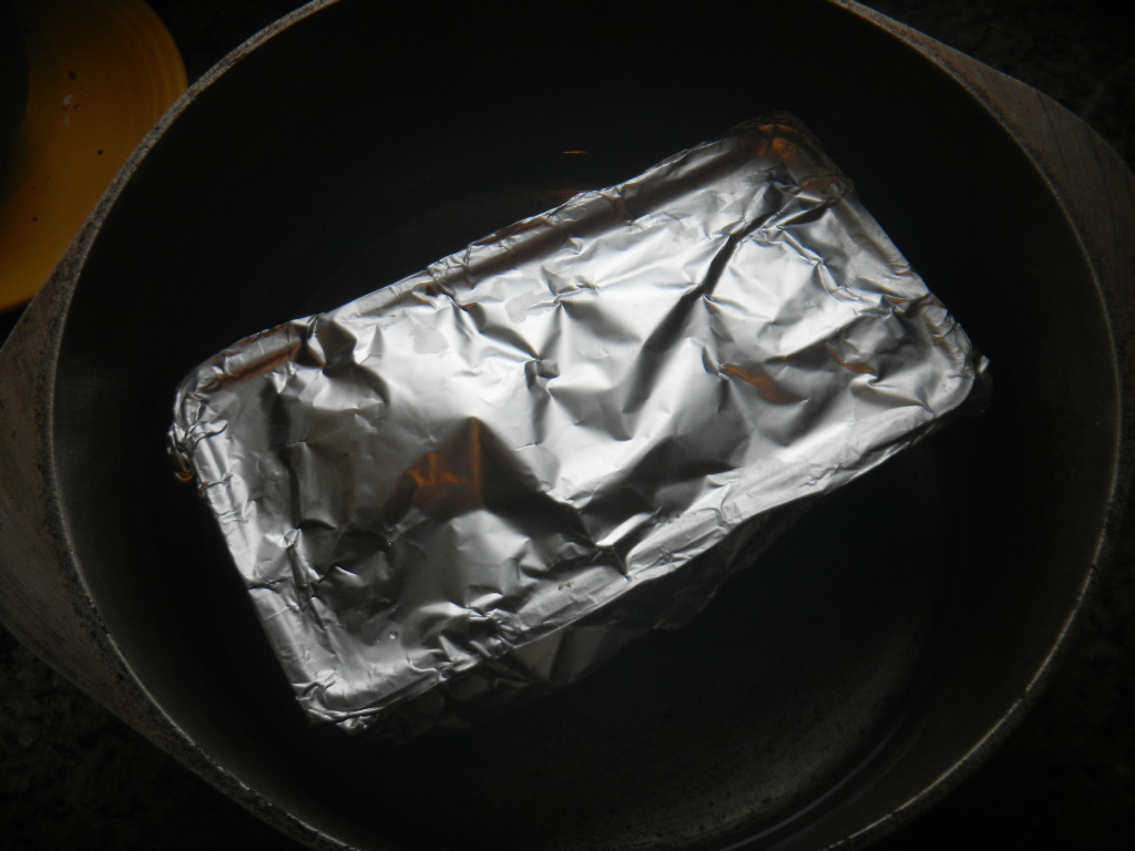 This is a mix everything, autolyze for 1 hour and dump it in the pan recipe. Then I covered it with foil to keep the moisture in and then put the pan in a pot with 1 1/2“ of water in the bottom and then covered the pot with foil too. Then into the mini oven it went. You don’t want this bread to dry out because it will become harder than a brick and last longer than one as a building material too.