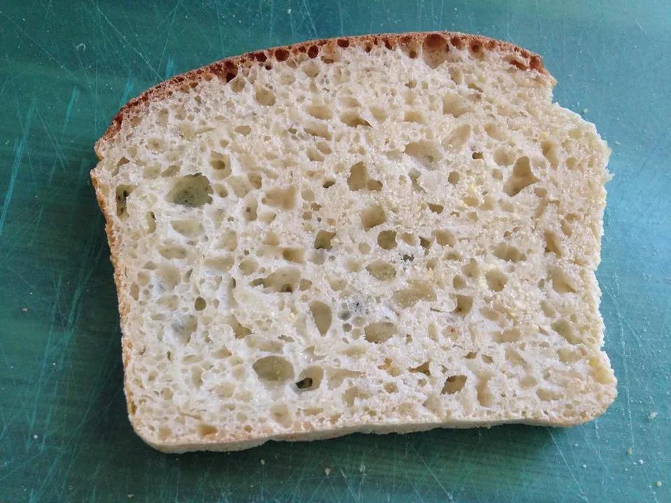 So this time, I tried letting it proof on the counter despite the cooler kitchen temps. I also decided I wanted to add a sourdough flavor and substituted a cup of my sourdough starter and made adjustments in the amount of flour and liquid I used. Oh man, when it baked, the loaf sprung up nicely! The slice pictured is the result and it's got a great hint of sourdough. Fantastic with some raspberry jam.