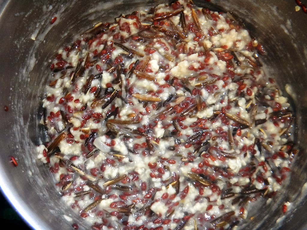 The 60 g dry weight of these 3 grains came out to about a total of ½ cup. We simmered them on low for an hour before taking it off the heat, taking the lid off and letting the porridge dry out and cool. It weighed 230 g when it went into the dough. This wet mess took the overall hydration of the dough to 100% or so.