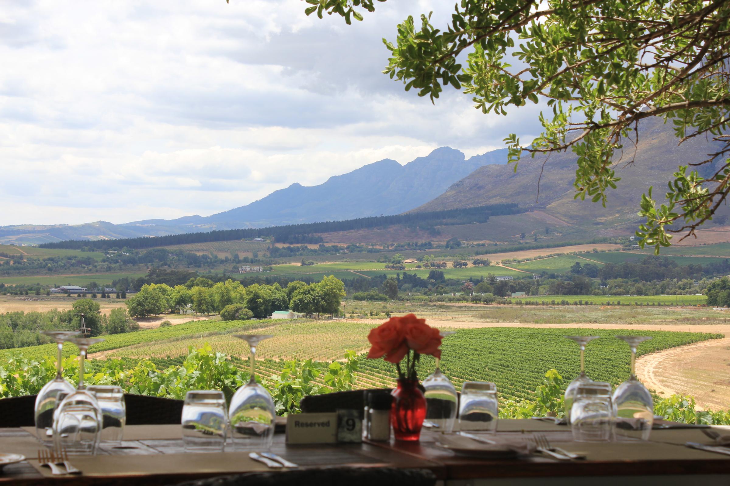 While in South Africa this past December, we had the chance to spend a few days in the Stellenbosch area; not far from Cape Town and in the middle of South Africa's winelands. Stellenbosch is a picturesque town in its own right, replete with many examples of the Cape Dutch arhictectural style. It is surrounded by vineyards and mountains and olive groves and lavender fields and is so beautiful as to make the flatlander tourist gape in wonder. You could, for instance, have lunch or dinner at a vineyard's restaurant and enjoy scenery like this: