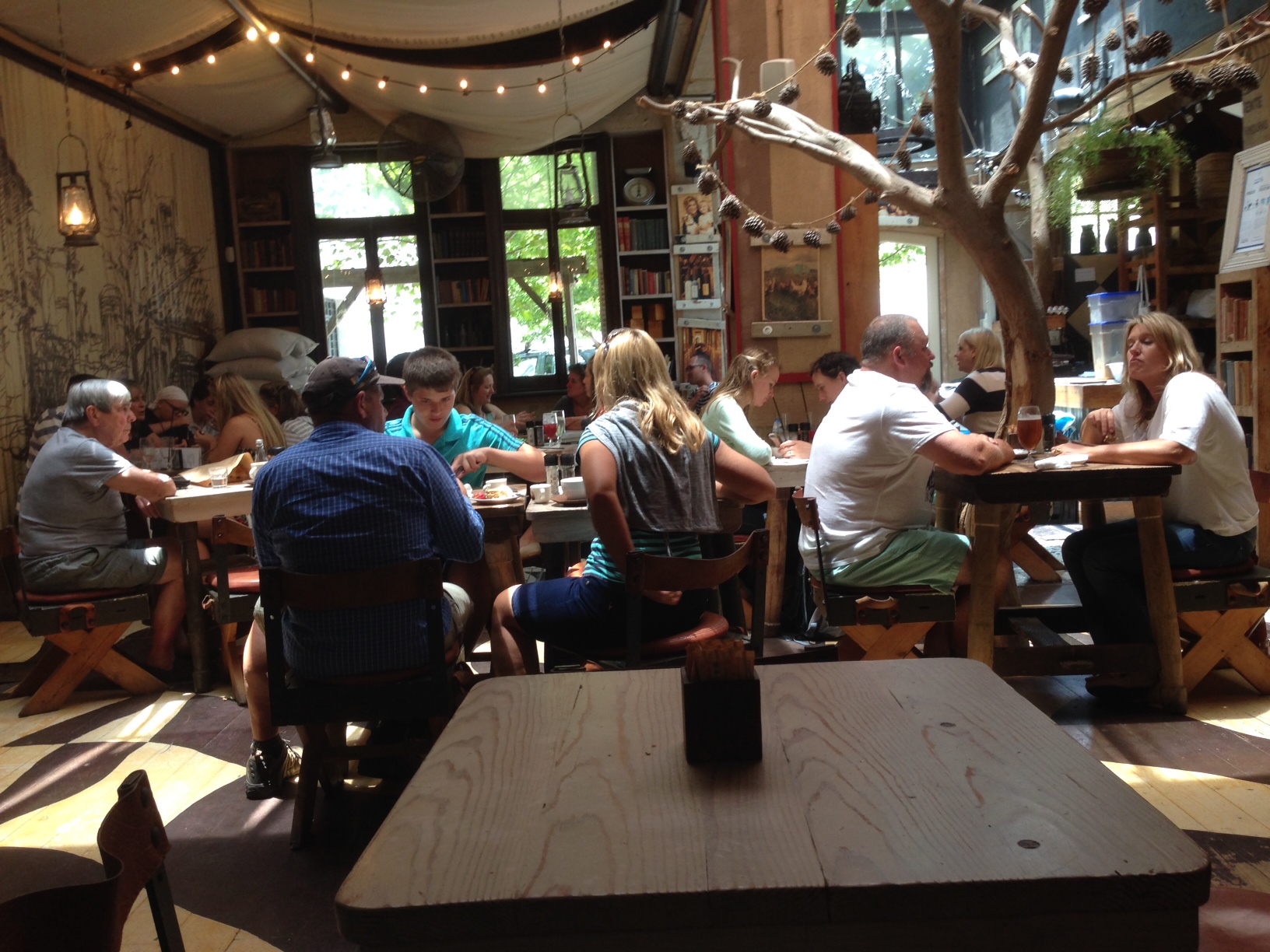 The cafe features equal measures of rusticity and whimsy, finding expression in everything from the floor pattern to the tree reaching toward the skylight.