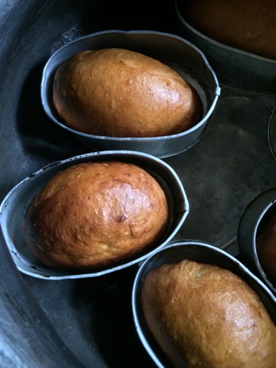 I know you want to see my clay pot and set-up so here it is. The interior just after baking with the rolls nicely browned in their llaneras.