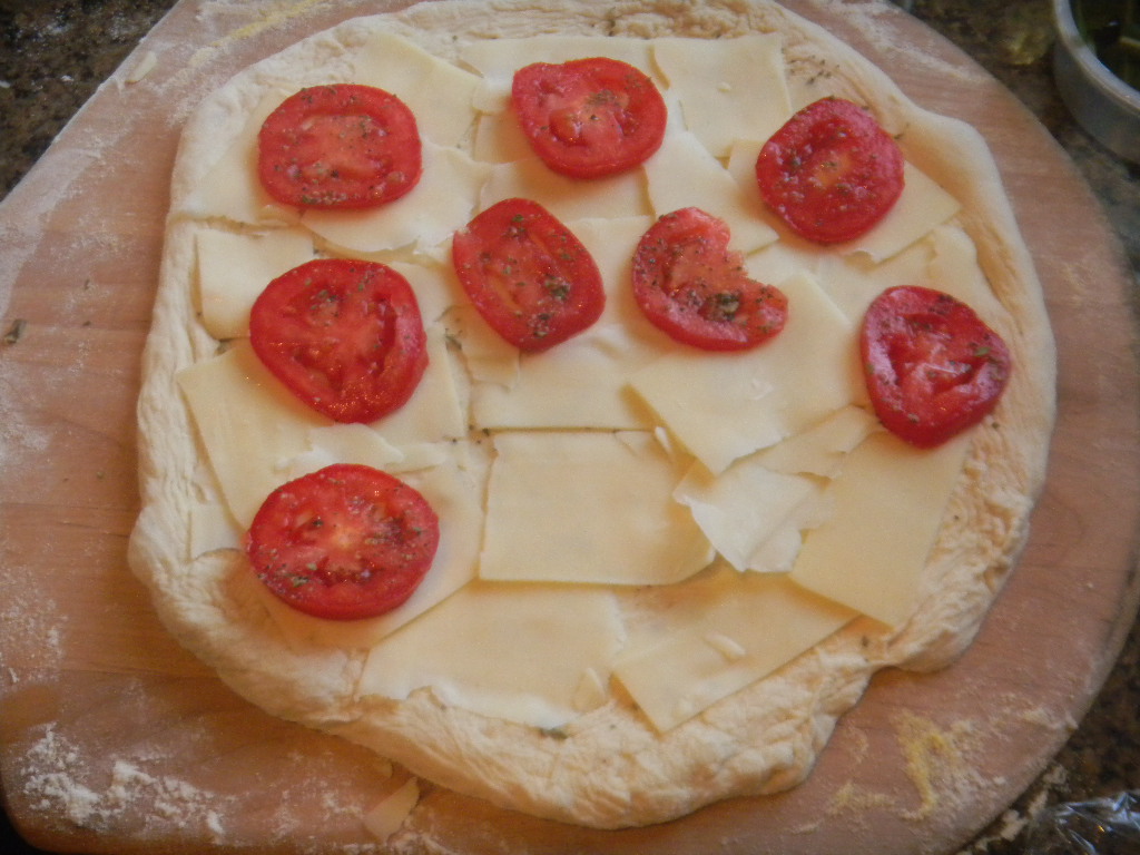 Instead of retarding the dough for 12 hours we retarded it for 48 hours.  Instead of coating the formed pes in Mojo de Ajo before the sauce goes on ( a mistake in hindsight), we just sprinkled some dried garlic on it and no sauce either.  We put a thin layer of Monterrey jack cheese down first and no mozzarella to be found anywhere either.