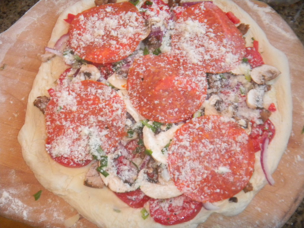 We haven’t made any pizza for a while around her for some reason.  It isn’t like we don’t like pizza but it is pretty messy when it comes right down to it – at least it is when Lucy and I make it at any rate!  Flour, semolina, corn meal everywhere, frying the Sausage, chopping all the toppings…..Yep I’m guilty and Lucy looks guilty.