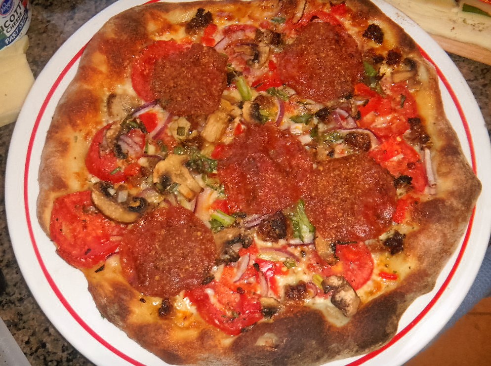 This dough was not as extensible as an AP one, out favorite, but it also too manhandling better and was stronger so it didn’t tear either.  I liked it for stretching.  My wife didn’t like the taste of this dough and thought it was chewy. She is always right of course.  Compared to our favorite, flavored dough, this one is pretty boring and it is chewier than our usual AP dough and it didn’t get as crisp too – but I think that was due to the new oven and not getting the stone hot enough long enough first.