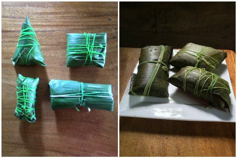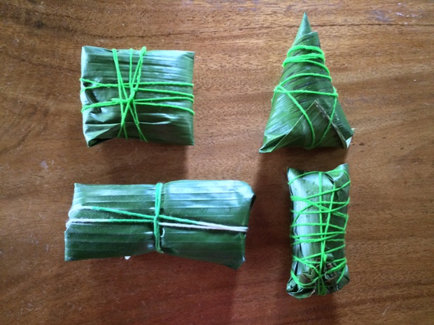 Wrapping in banana leaf is difficult and needs a different technique than using bamboo leaves and this is just my "REAL" first try at wrapping rice dumplings. Tying is "anything goes until sealed" and is even more difficult than the wrapping. They are then boiled for 4 hours,