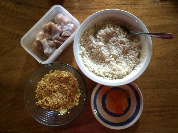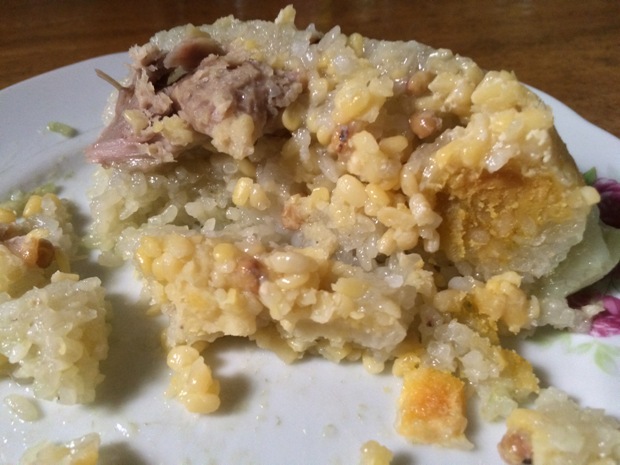 The rice was properly seasoned and soft, the mung beans are slightly sweet, the salted egg yolk is rich with the right saltiness but the pork is slightly saltier than preferred; I should have soaked it longer.