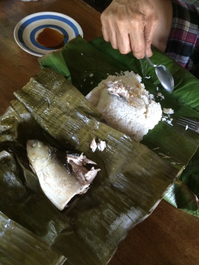 With all the banana leaves, dad made a nostalgic treat for him. Rice wrapped in banana leaves. He said that's what he brings to school back in the days prepared by my grandmother. Warm rice is wrapped in banana leaves sprinkled with a little salt; when opened, the aroma of banana leaf that perfumed the rice perfumes the air. He paired it with stuffed steamed milk fish in guess what.... of course, banana leaf!