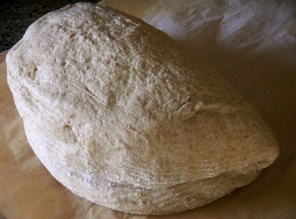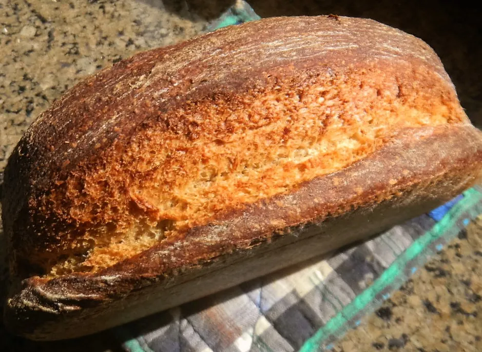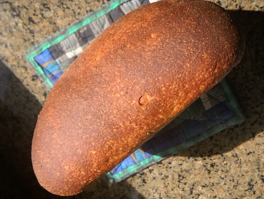 This beautifully risen loaf should have been slashed and baked rtter than folded over to bring out its full potential..