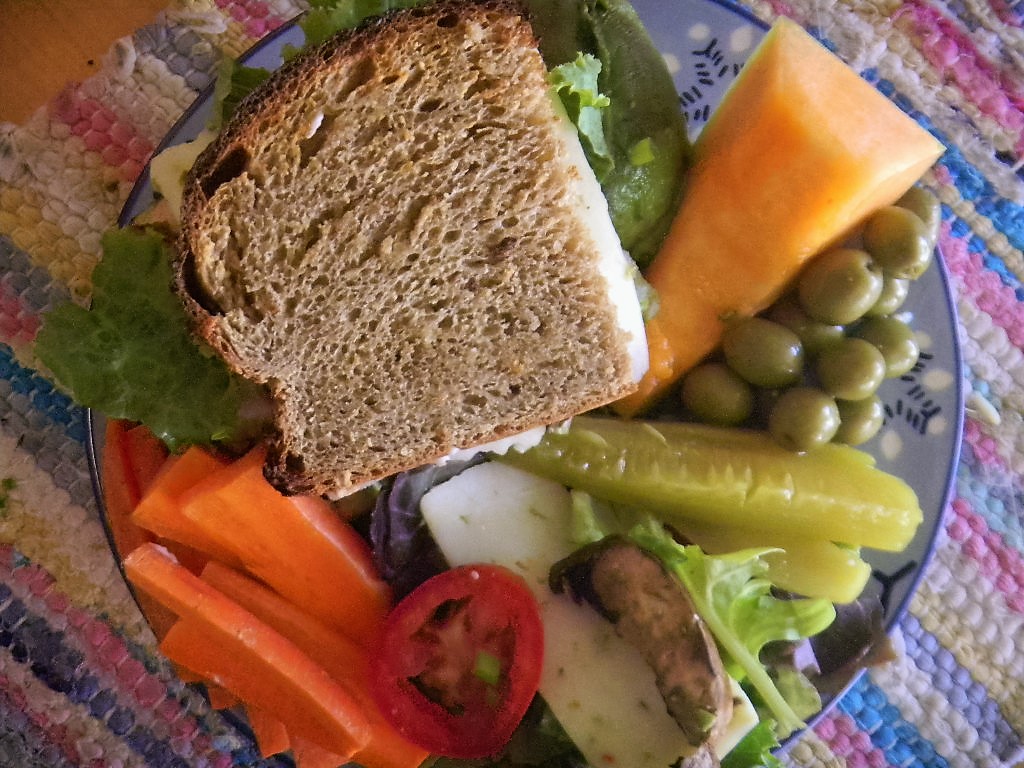 I don’t have much hope of the crumb on the bottom section but hopefully the top half will be OK. We shall see once it cools. We are pretty sure the flavor problem of this bread will be cured just from the aroma it is putting off on the cooling rack! This bread is as tasty as any other whole grain sprouted bread that we have have made lately with the added bit of a slight sweet nutty finish. Just don't fold it over like this doofus did. The crumb din't come out as yellow as we hoped - too many whole grains:-) It made a great grilled chicken pepperjack cheese, avocado, lettuces and tomato sandwich for lunch with the usual fixings.\