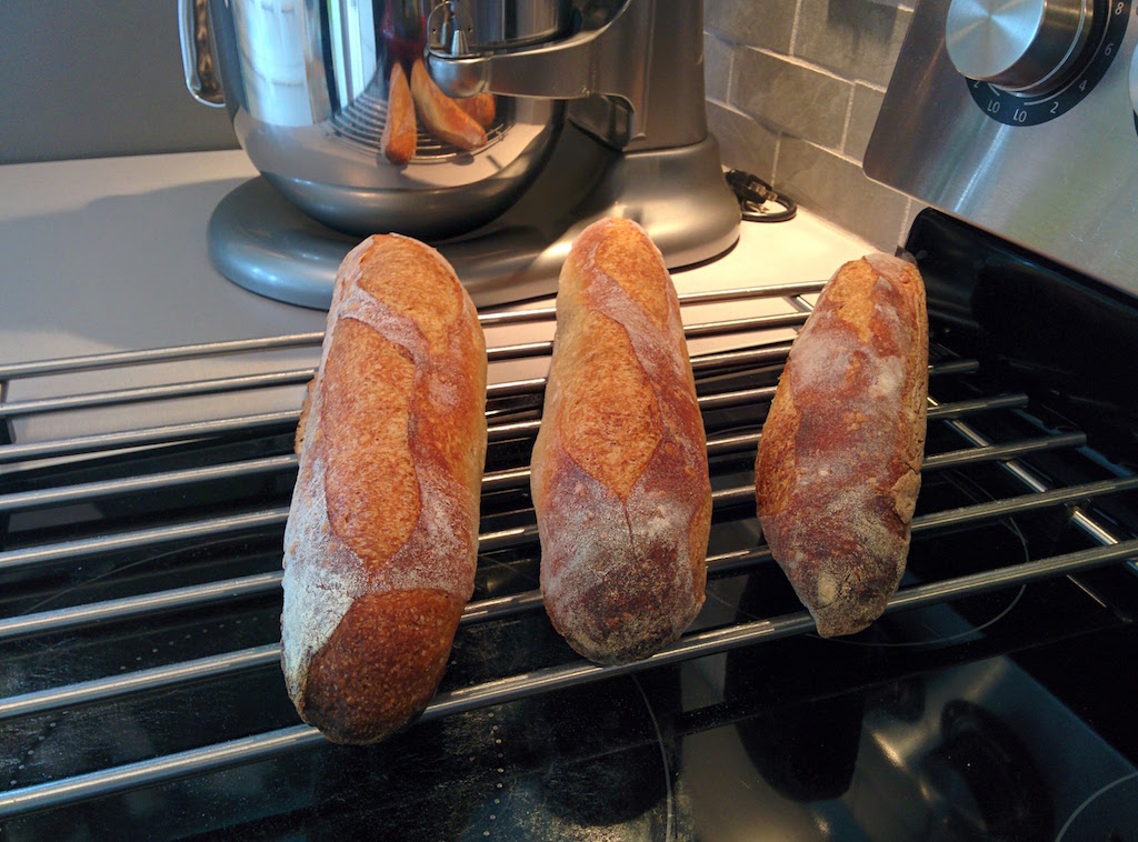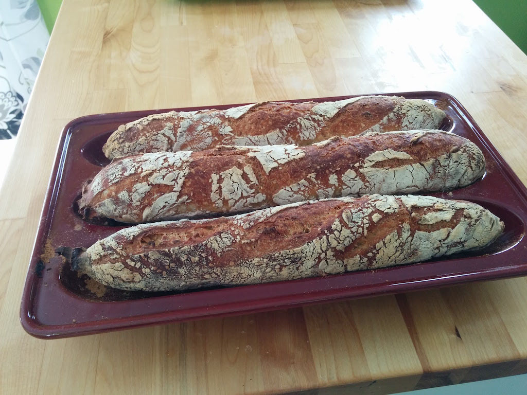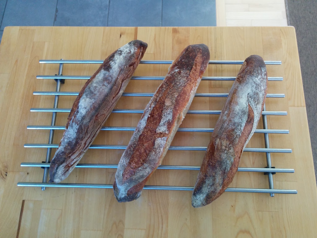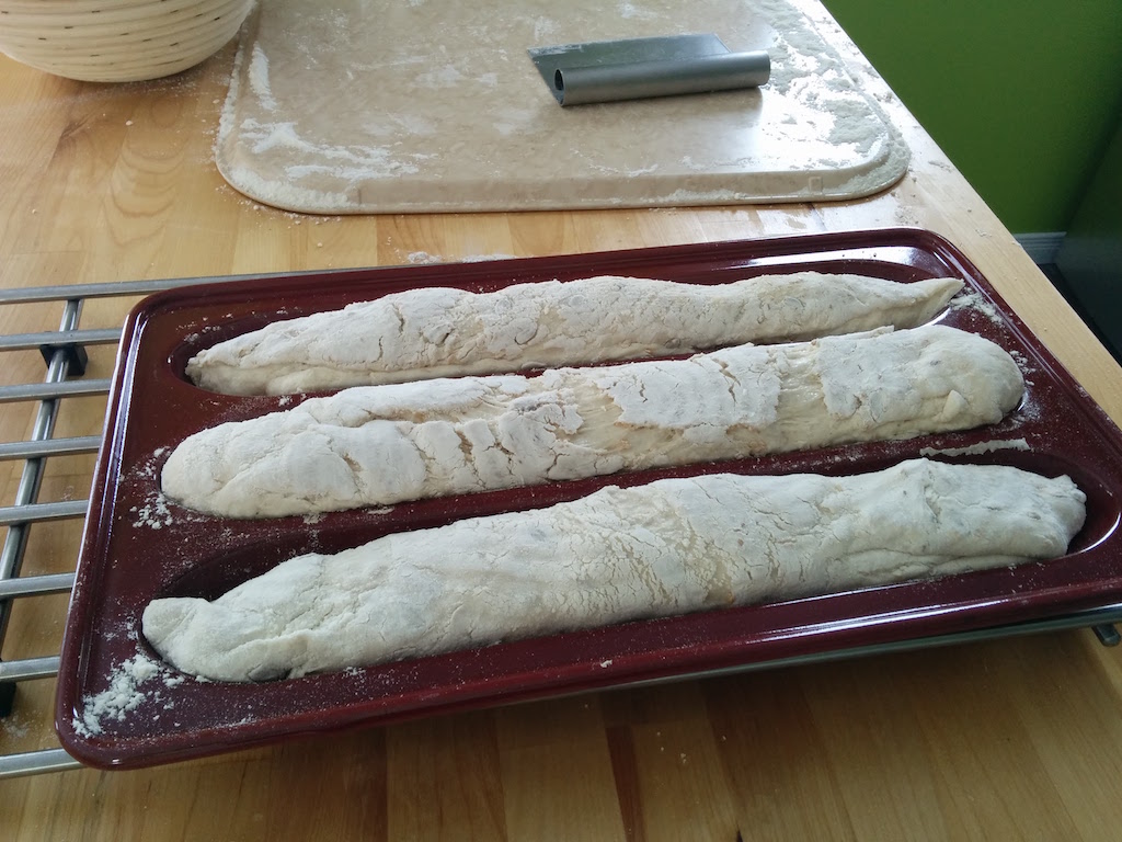 Looks good - and nice to see you're not afraid to use shaped baguette tins either. I have a set of the perforated ones - that takes 4 baguettes at a time which work well, although they're not long enough for my current desires, however for easy shaping of demi-baguettes they still work well.