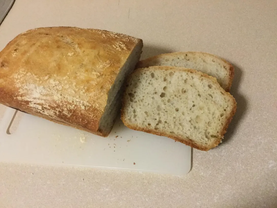 It was a very wet  but lively dough which took some time to prove. I added some garlic and basil to the final mix which I can taste but not see in the crumb. I fully expected it to flop in the oven but low and behold it did rise, not hugely but some. The crust tastes slightly sweet ( might be my imagination ) and the loaf is quite light weight wise.
