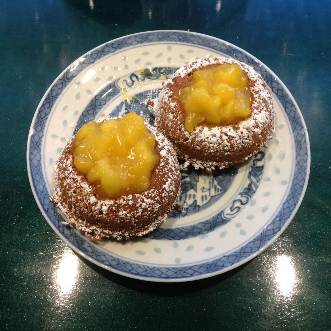 With Brown Sugar, Nutmeg, Cinnamon, Ginger and Allspice. Not to mention walnuts, coconut, vanilla chips, candied tangerine, lemon and almond extracts, of course. Mini, sometimes I over-fill the "craters" so the filling doesn't fall through, but today's batch were left open and the fruit all stayed put anyway. Guess there was enough potato starch in the orange pineapple glaze to keep it from leaking out the bottom, was pleasantly surprised how non-messy they turned out.