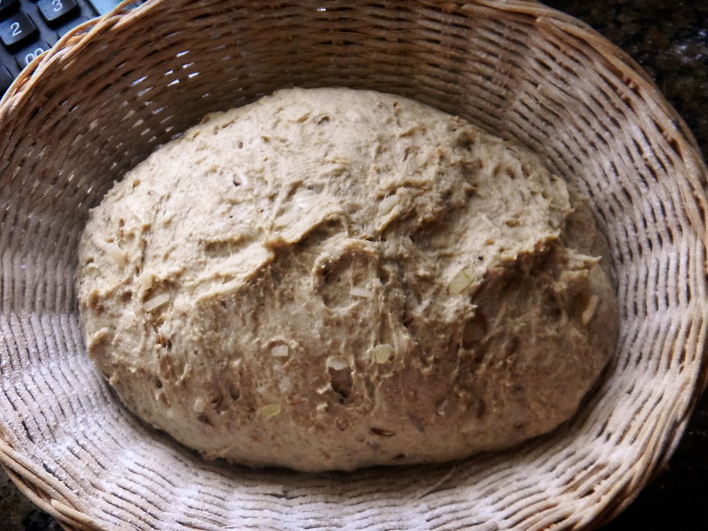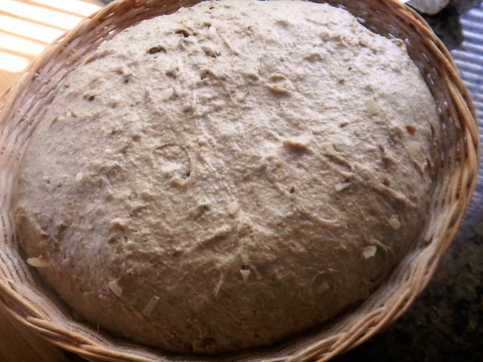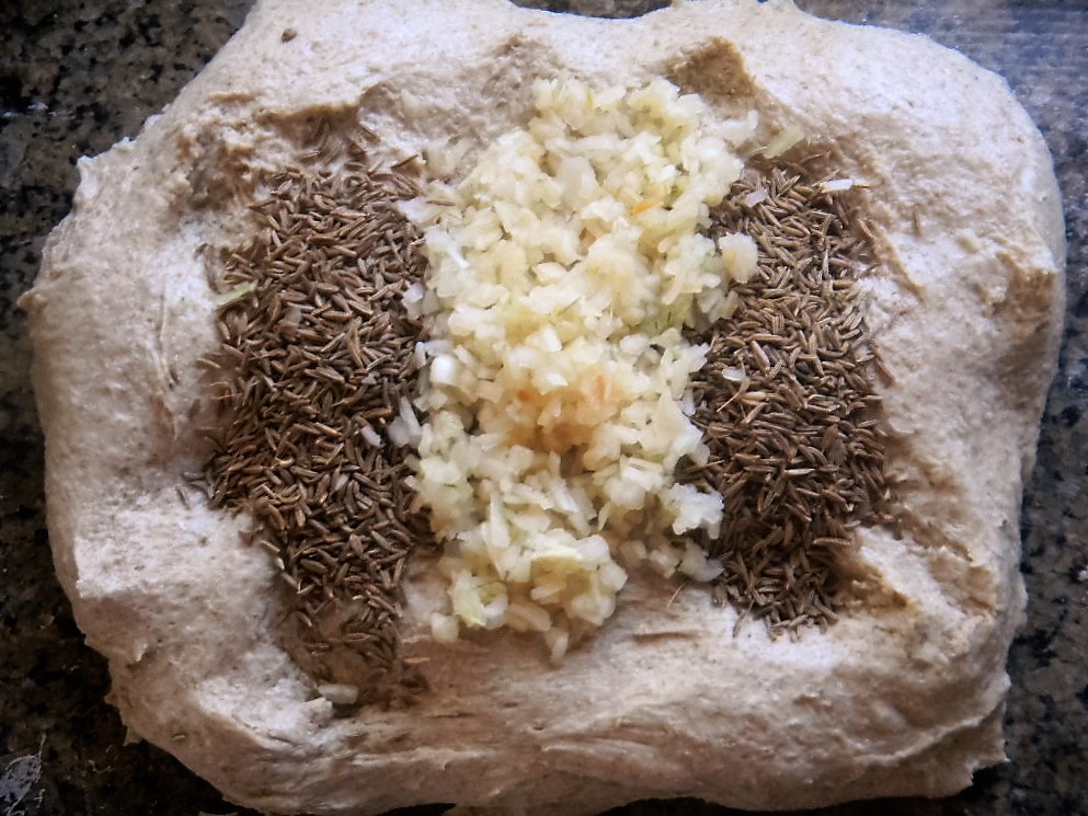 Once the Levin had risen 25%, about an hour later, it was added to the autolyze and we did 3 sets of slap and folds of 60, 20 and 20 slaps each and 3 sets of stretch and folds of 8, 4 and 4 stretches each. The 2.4% each of caraway seeds and rehydrated and drained minced, dried onions were added during the first set of stretch and folds.