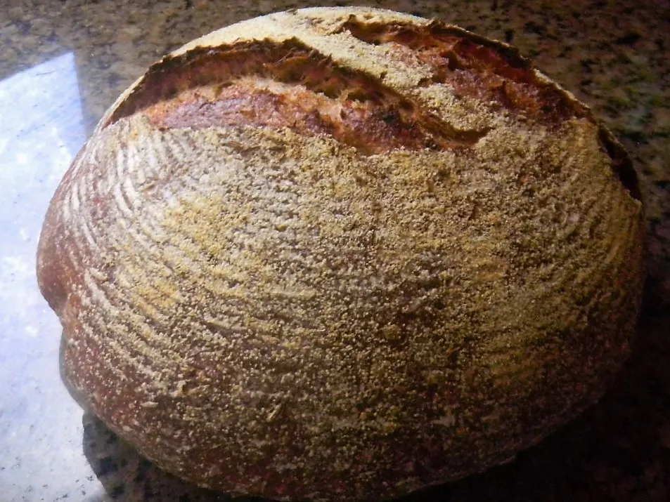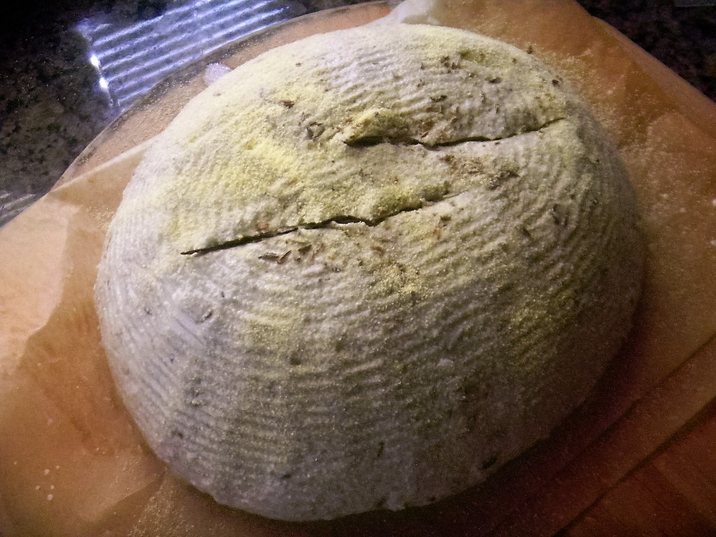 The dough proofed well in the fridge so when we took it out the next morning we also immediately fired up the oven to the 500 F pre heat with the combo cooker inside. We un-molded the dough onto parchment on a peel, put a cornstarch glaze on it, sprinkled it with corn meal, slashed it twice, slid it into the CC and into the oven it went as we turned the oven down to 450 F.