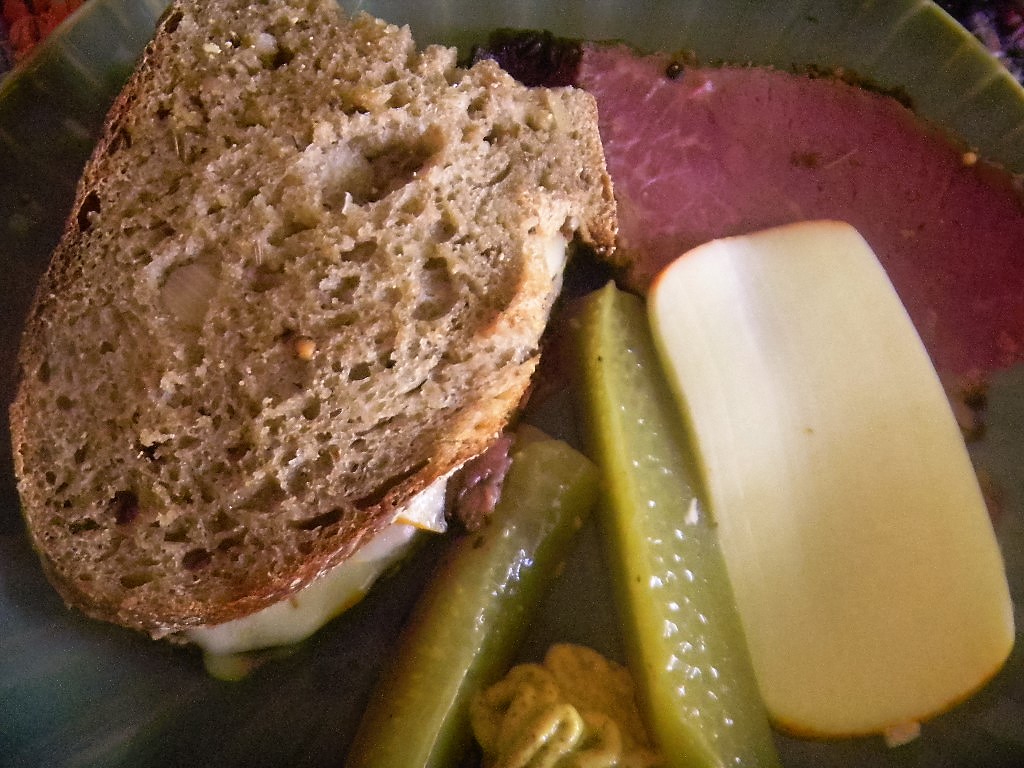We already make a pretty good Jewish Deli Rye but using 40% whole grain rye and 10% whole grain wheat, half sprouted with caraway and minced dried onions takes it up a notch on a health and taste front. This is what JDR was always supposed to be! With homemade pickles, mustard and pastrami, this sandwich is the best we have managed in our quest.