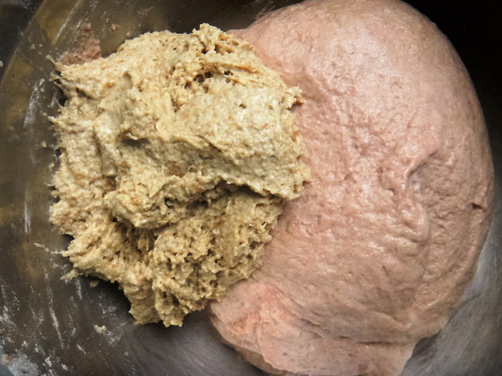 Putting the hard bits in the levain gets them wet and attacked by the SD acid as long as possible to reduce cutting of the gluten strands and the bran provides a buffer so the LAB can produce more acid at a lower pH than normal. The result is that your bread will be likely be softer, loftier and more tasty too – a real three’fer if there ever was one!
