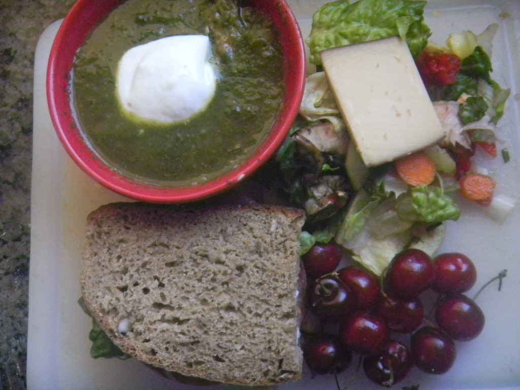 Leek, Potato, and Lettuce Soup with half a pulled pork and rye sandwich and a bit of salad.