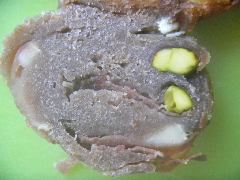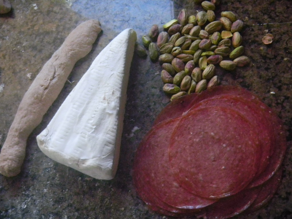 So, we had to come up with a more unusual one for this special bake. Besides the 3 main grains we included, Pima Club, white wheat, emmer, oat, einkorn, buckwheat and Kamut. The dough liquid is a 2010 Beaujolais. The insides of these unusually rough topped rolls had pistachios, brie and salami. Now Lucy can sit by the pool, in the AZ sun and imagine she is in Paris, on the Seine at a nice café having the usual fare all in one bite.