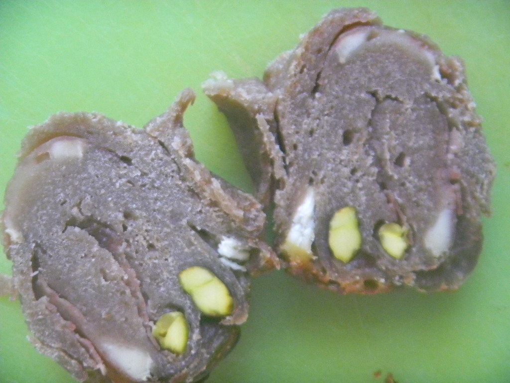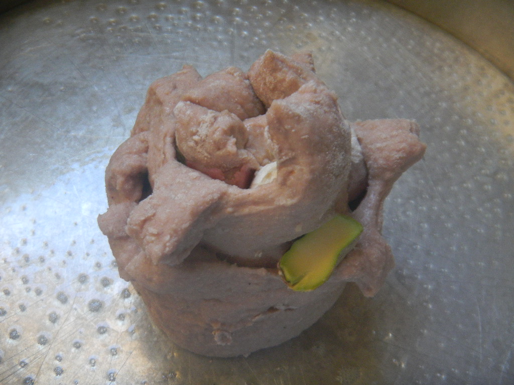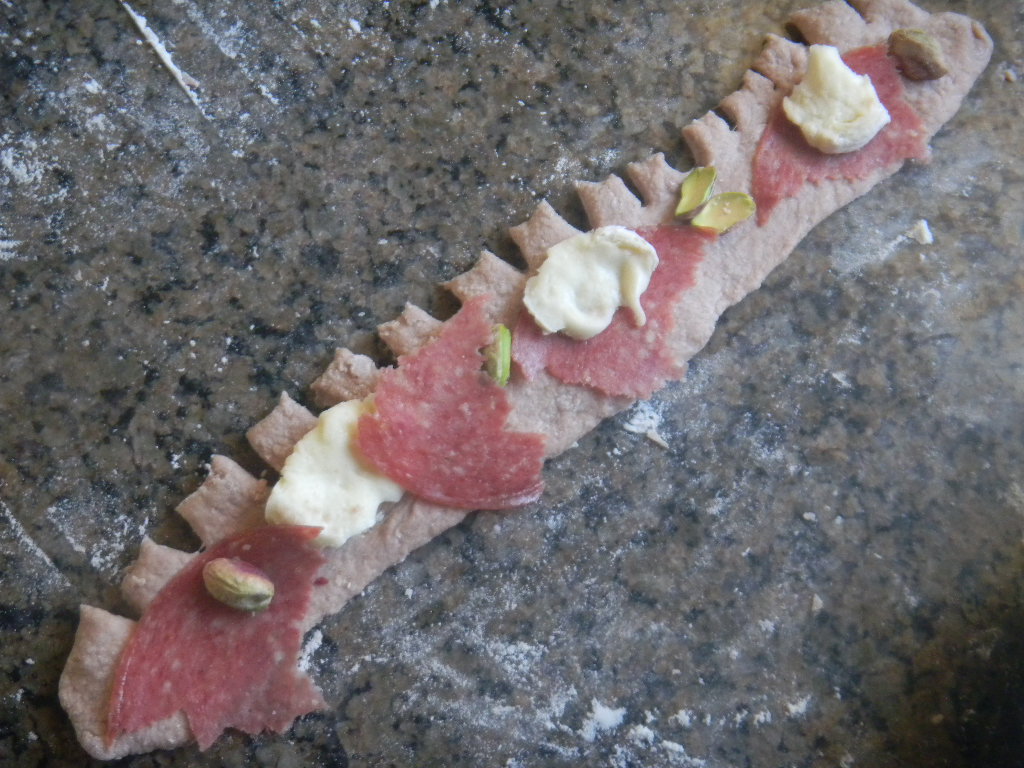 While the dough was resting, we got the fillings ready by shelling the pistachios, and getting the sliced salami and double crème brie portioned. We then portioned the dough into (12) 76 g pieces and rolled each into a rope using the palms of the hand – just like making bagels