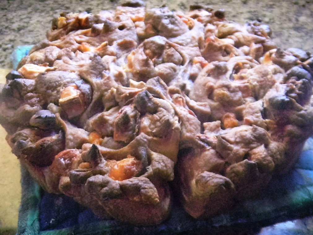 of grape juice, That is nothing but sugar and not good at all for us diabetics. I'm not fond of the wine taste in bread either. Better to drink it with the bread:-) We will give this a go without the wine for sure since we love the cool, comb shaping and the pull apart roll part. The brie salami, and pistachio part was OK too.