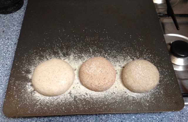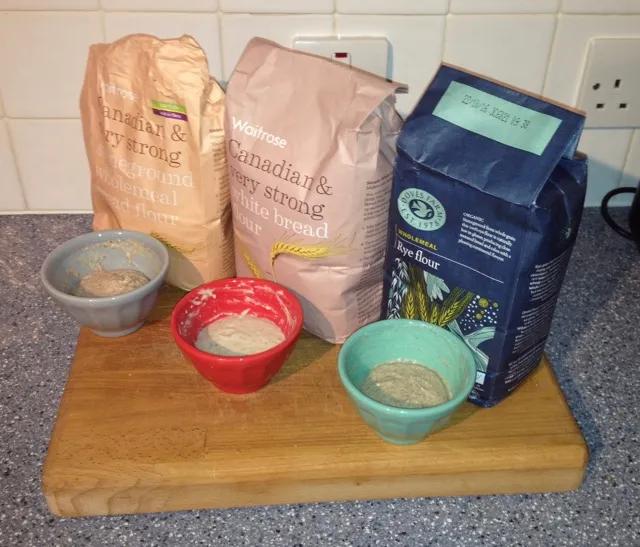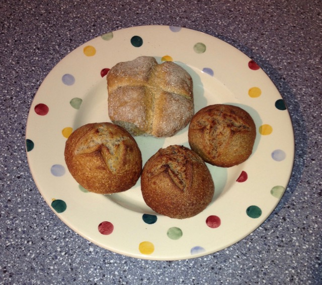 Each loaf (haha) consists of 50% strong white flour, one is all white, the next is wholemeal and the next is rye. The 'interloper' at the back is a 75g wholemeal rye Soda bread that I made at the same time (to use up some fresh buttermilk from this weeks butter production, and because the oven was hot!)