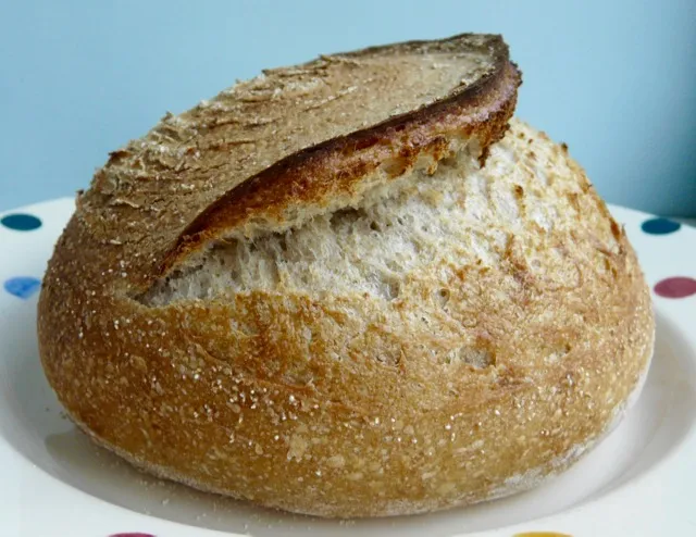 I baked my version of your loaf yesterday. I was also very pleased with the results. I only changed a couple of things in your recipe, with the salt being one of them. You initially said 3 grams, but stated that you ate it with salt, so I increased the amount to 4 grams. I really think that 6 grams might be too much, at least for me. Also, you used 40g of rye starter in your second build, from your first build of 45g. I used the entire 45g+45g flour+45g water, so a total of 135g in the final mix, where as you used 120g. Not too much different! I however, forgot to spray the Dutch oven when putting the bread in. OPPS. I don't think that I got quite as much oven spring as you did, and that mistake may have contributed. In addition, I probably didn't make my score long enough, because there was some tearing at the ends of the cut. Over all though, delicious bread. No mistaking that this is sourdough.....very tasty. I will definitely make this again, possibly multiple loaves next time. I love the simplicity of it. Thanks again for the recipe. I have never posted pics before, but I'm going to give it a try now!  marybeth