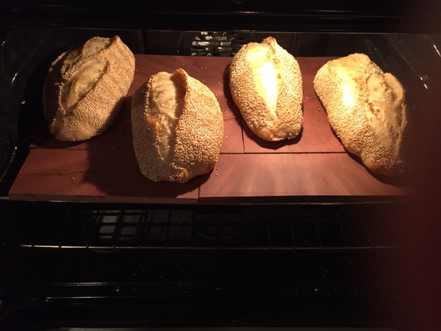 Just today I completed my largest bake to date.  2.4k (that's where the lack of self-control rears its ugly little head) of the marvelous Semolina Capriccioso - my take on David Snyder's wonderful creation.  4 x 600g.  They were too large to actually fit into the oven across without getting into each other's way, so I staggered them.  For some reason these were a little too sticky and soft at shaping time, and therefore they showed a bit of reluctance in obtaining my more typical oven spring during the bake.