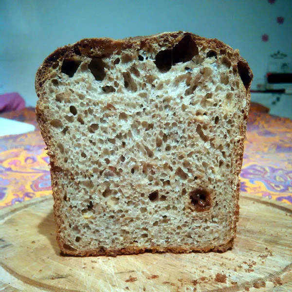 The combination of grains and cereals is just a non sweetened muesli mix that you can find in any store, thet contains rye wheat and corn flakes, sunflower seeds, linen seeds, hazelnuts and other dried fruits like figues, apricot, raisins, banana and coconut. I soaked one cup of this muesli mix in one cup of warm milk with some honey for some hours, and added to the dough in the last minutes of the mixing process.