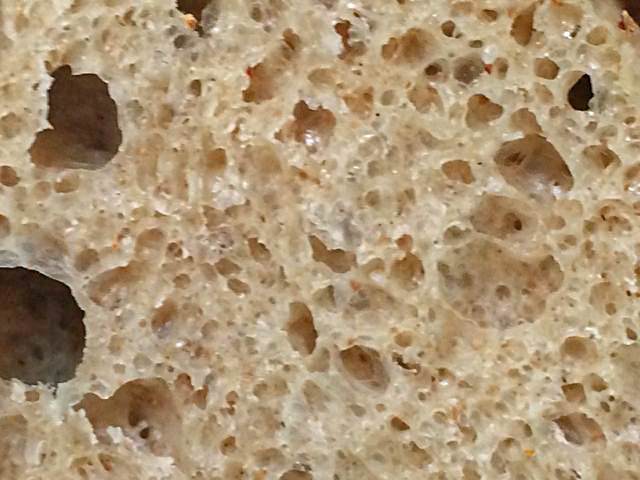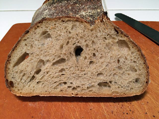 The crust was crunchy with a nice nutty flavor. The crumb was quite open – well-aerated. It was surprisingly chewy, given how little machine mixing I did and only one stretch and fold. The flavor was very similar to Hamelman's Pain au Levain with Whole Wheat Flour but more sour. I suppose this is the result of using the rye sour for leavening. This makes me want to try using a rye sour with some other flour mixes and other fermentation approaches. Stay tuned!