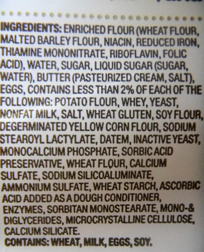 Has anyone ever said to themselves, after tasting one of their own breads, "The taste is great, but it seems like this bread could really benefit from just a slight touch of sodium silicoaluminate . . . " It's hard to imagine at what point during the development process all these unpronouncables make their way into a formula as simple as that for bread; far easier to see that this baker's priorities are way out of whack !